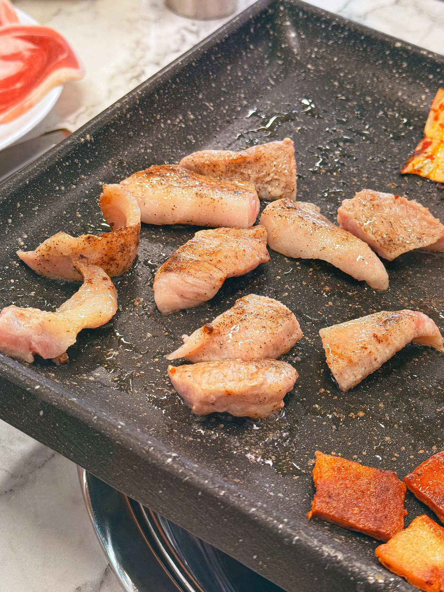 제주 맛집 현지인 추천 호돌이냉삼에서 주문했던 꽃냉삼, 항정살이 차례대로 나오고 불판이 어느정도 뜨거워지면 네모 모양의 비계덩어리를 활용해 기름을 낸 뒤 냉삼, 야채를 함께 올려주면 된다.