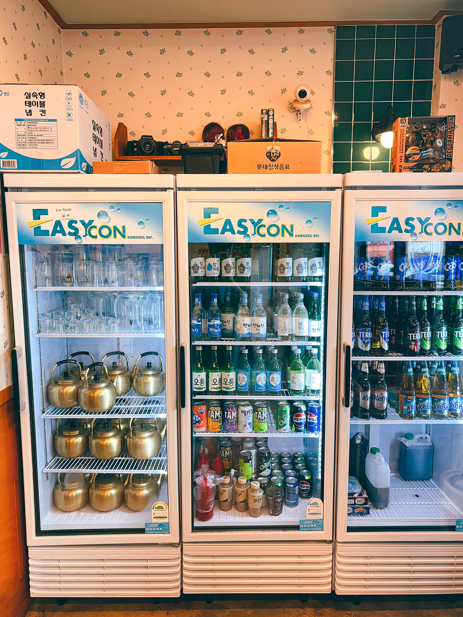 제주 맛집 현지인 추천 호돌이냉삼 카운터 앞에 있는 냉장고 안에는 여러 종류의 소주, 맥주, 음료수가 들어 있었고 레트로 스타일에 걸맞게 생수를 주전자에 보관해 제공되는 점이 인상 깊었다.
