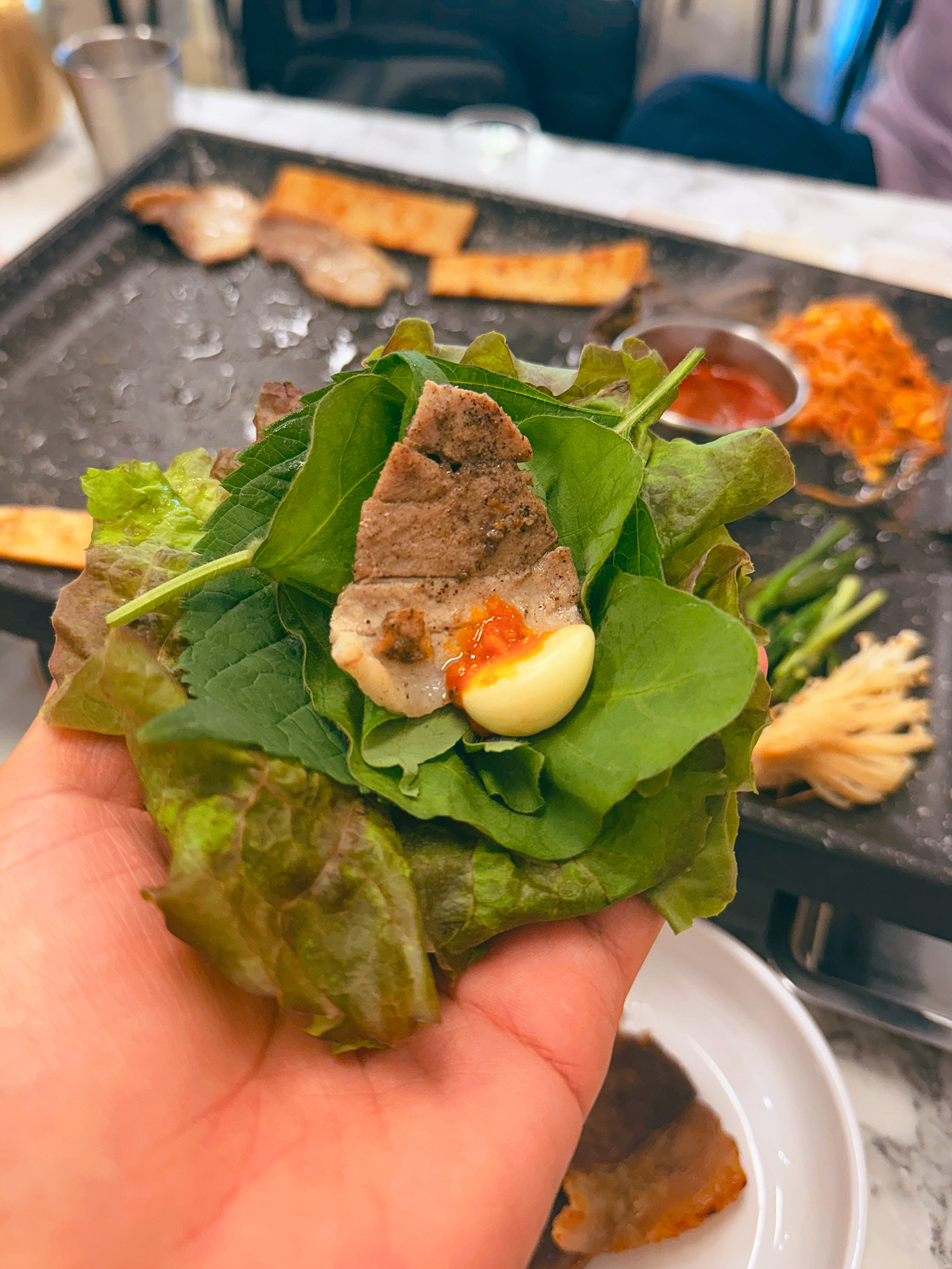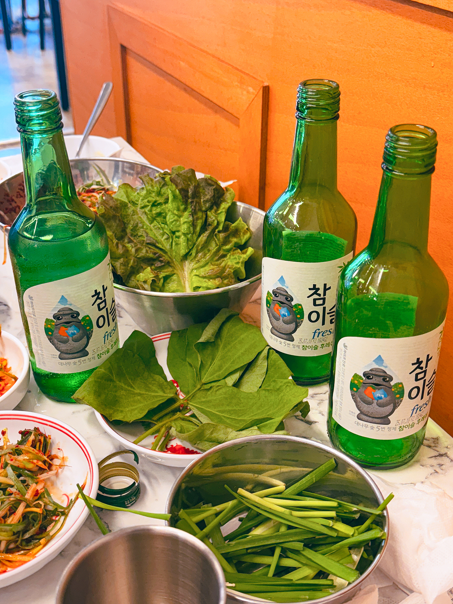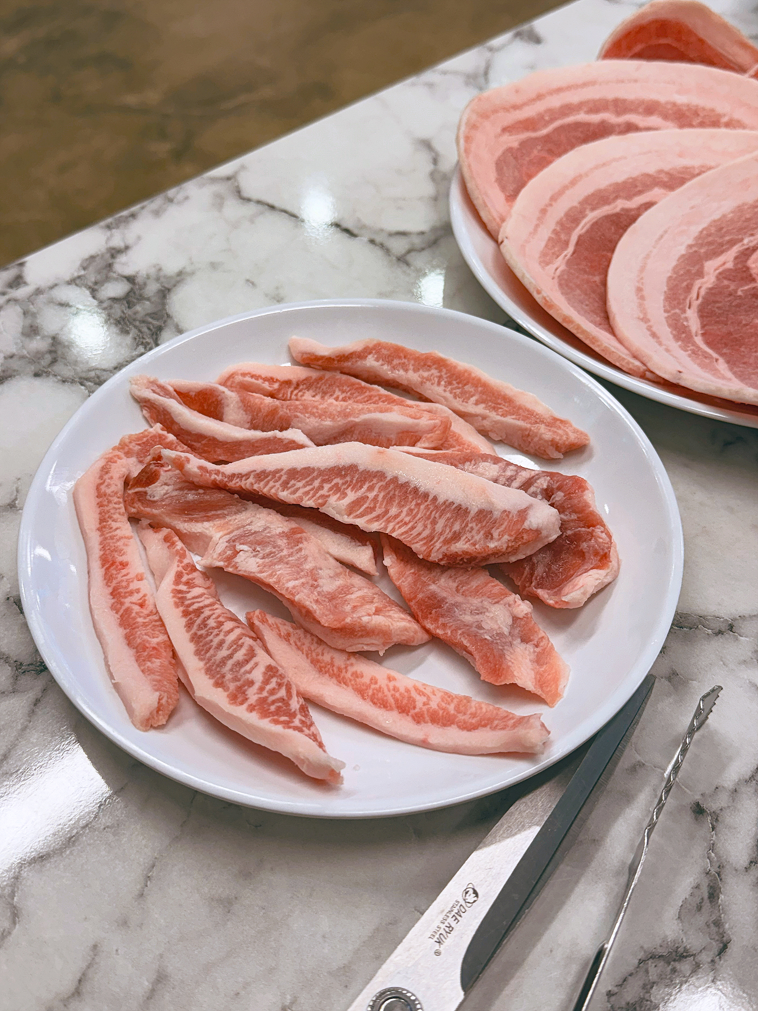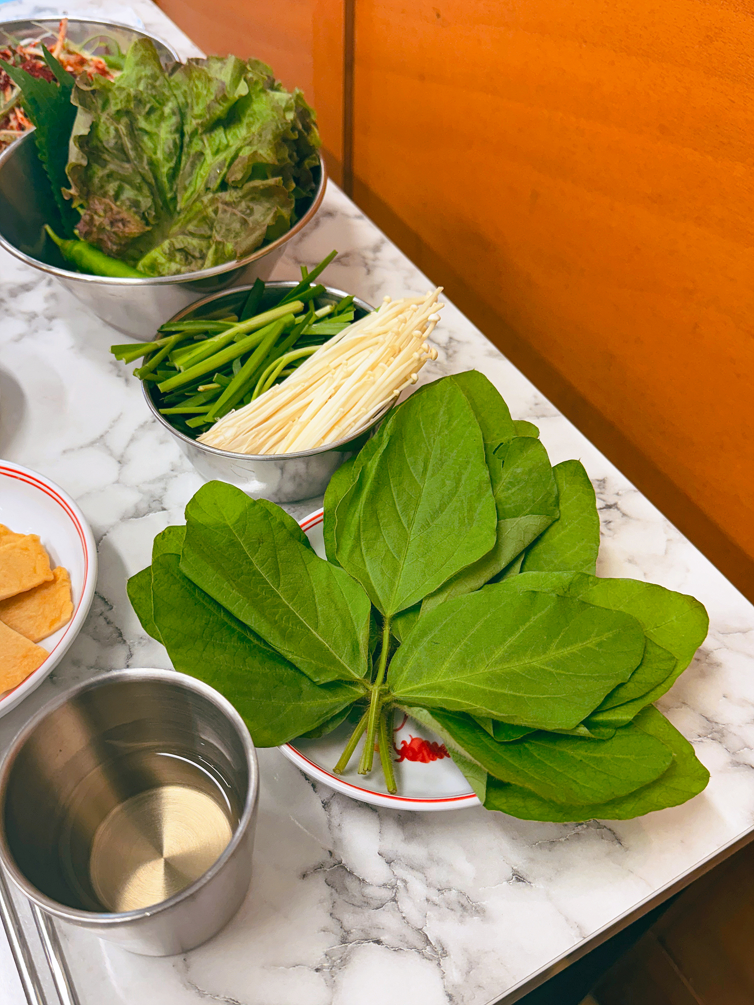 고사리, 콩나물, 부추, 버섯 등은 기름이 흘러내리는 곳 앞에 두어야 제대로 구워먹을 수 있는데 냉삼과 함께 곁들여먹기 좋은 메뉴로 구성되어 있다는 점에서도 마음에 들었다.