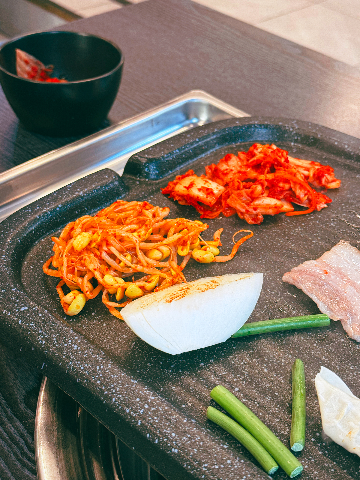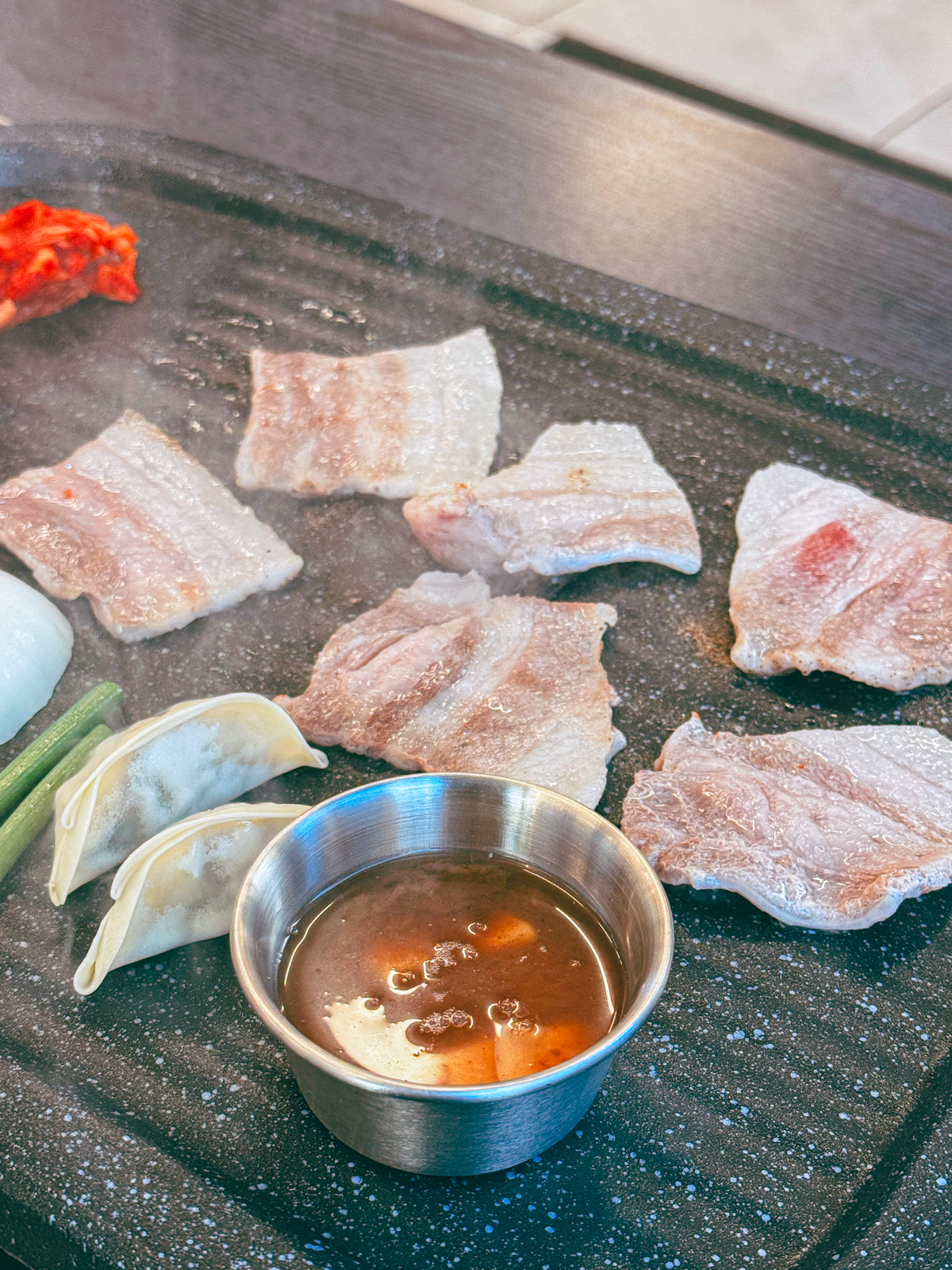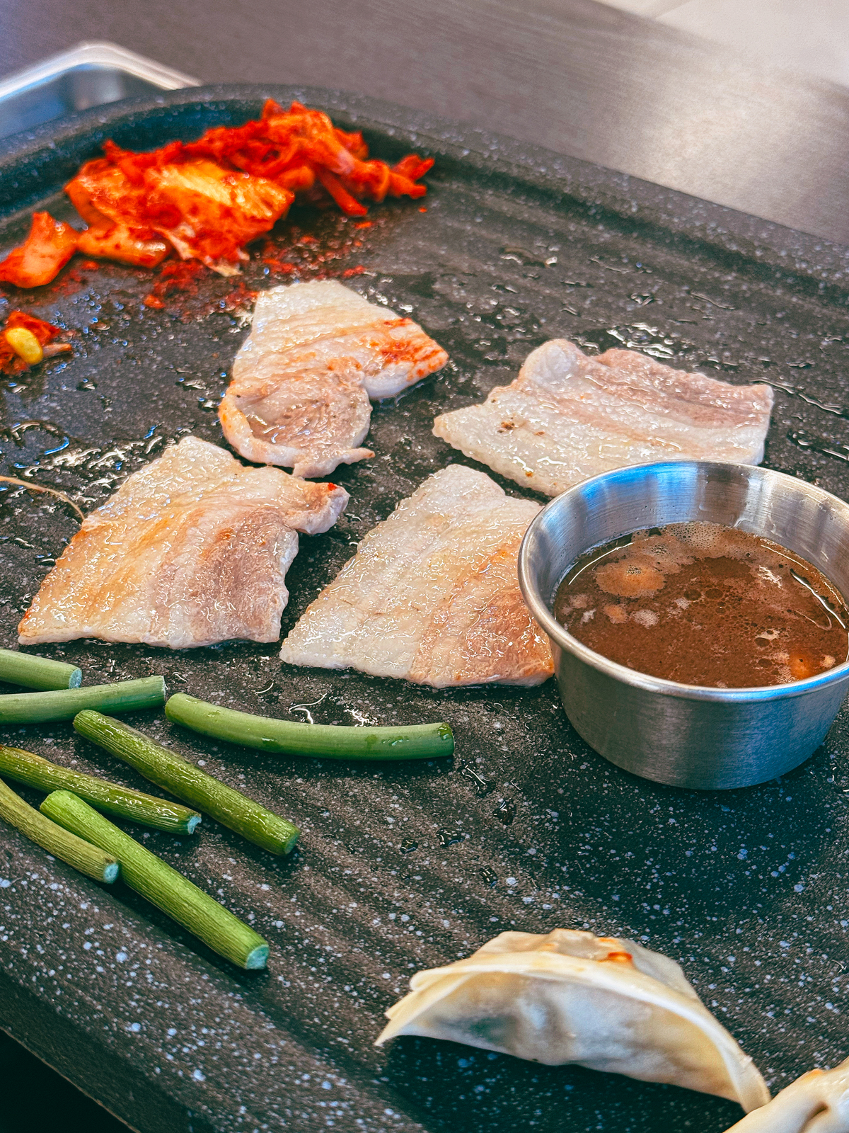 불판은 1단에서 2단으로 맞춘 후 주문했던 흑돼지 냉삼과 함께 마늘쫑, 만두, 콩나물, 배추김치, 양파를 올려 구워준다. 냉동삼겹살 기름이 흘러내리는 곳에 김치와 콩나물을 두어야 더욱 맛있게 먹을 수 있으며, 얇은 고기인 만큼 빠르게 익혀지기에 먹을 만큼만 구워주는 게 포인트다.