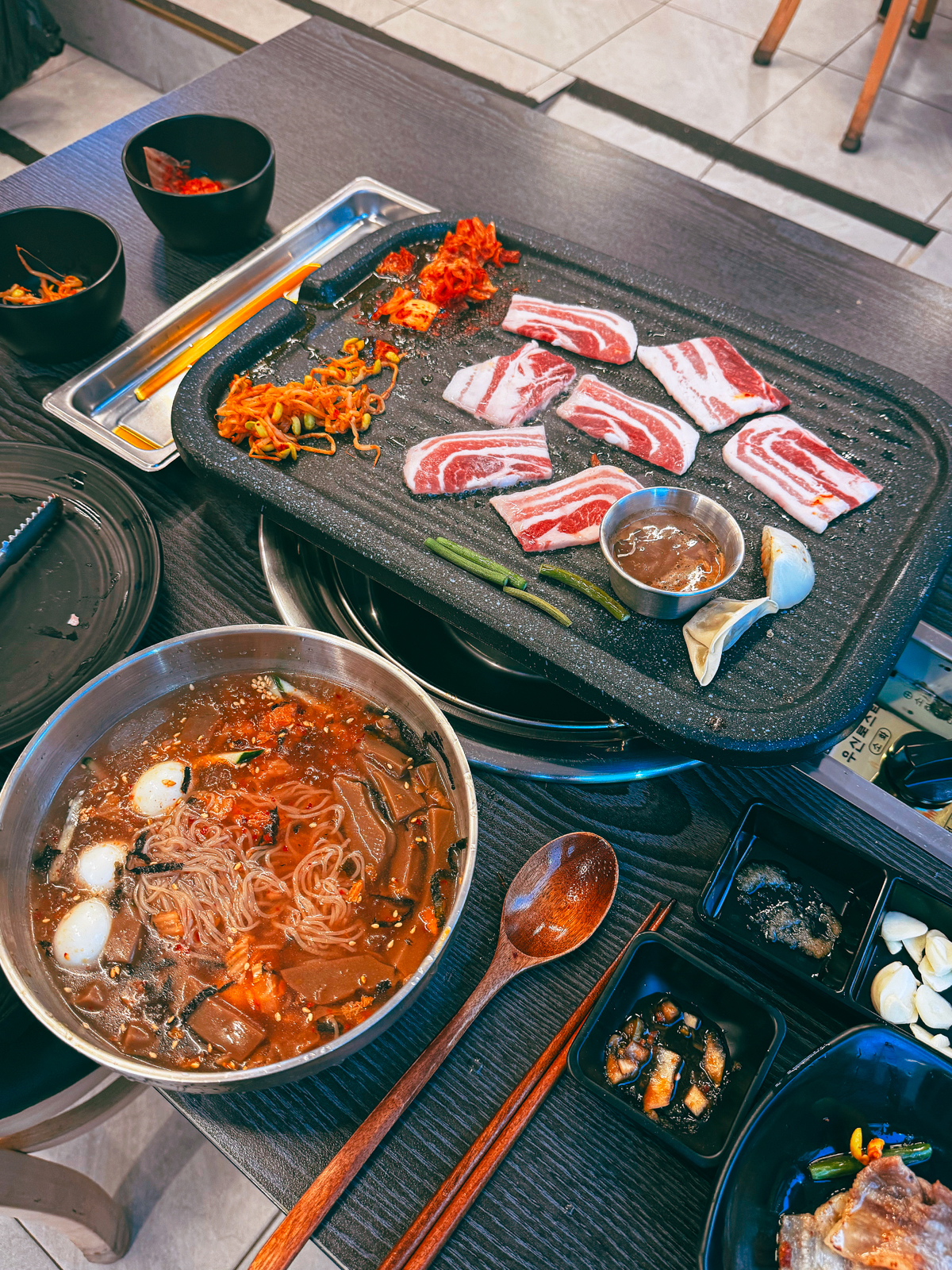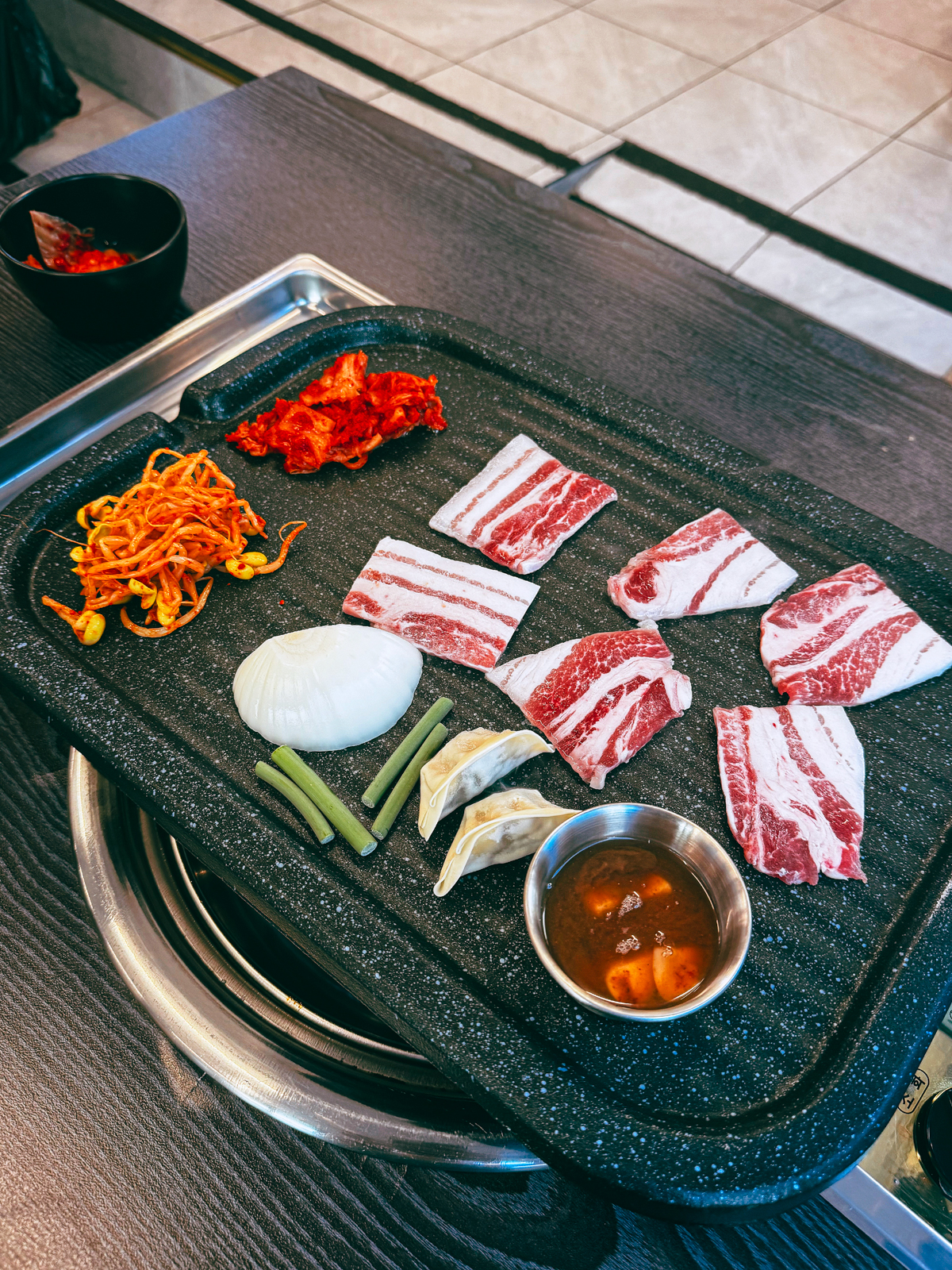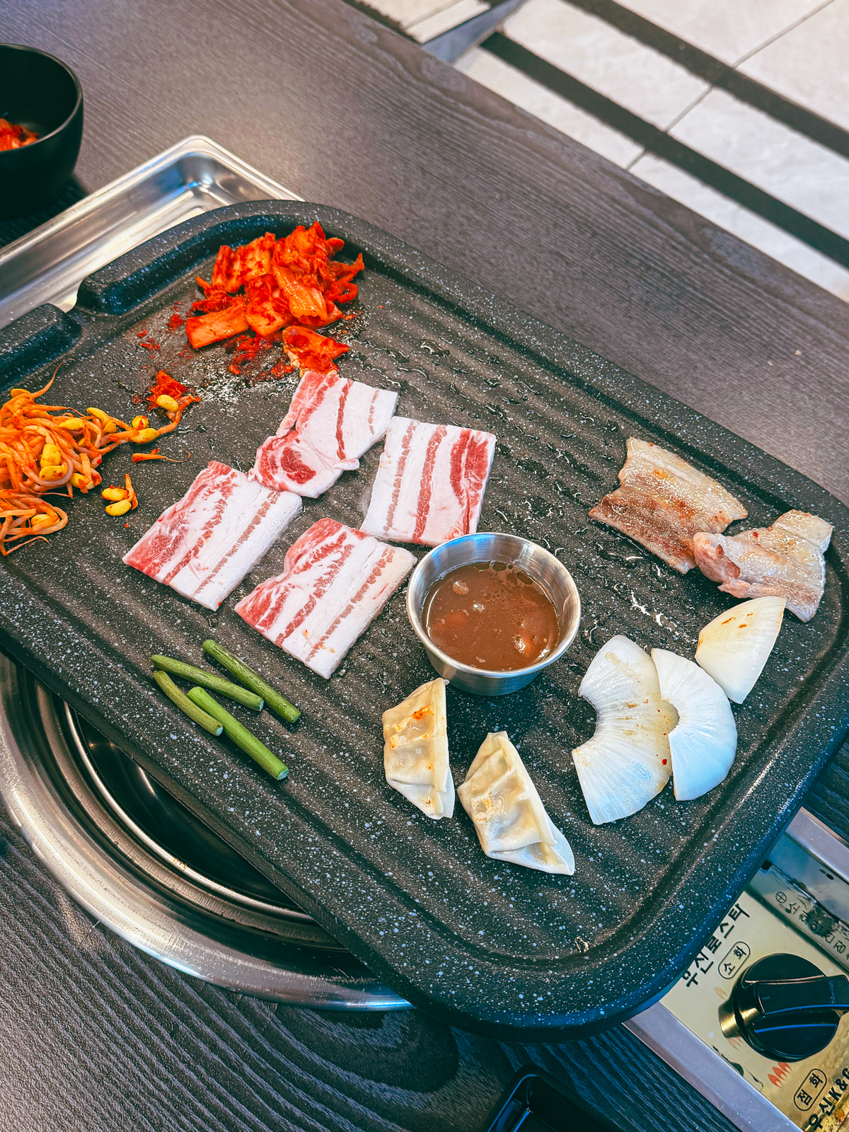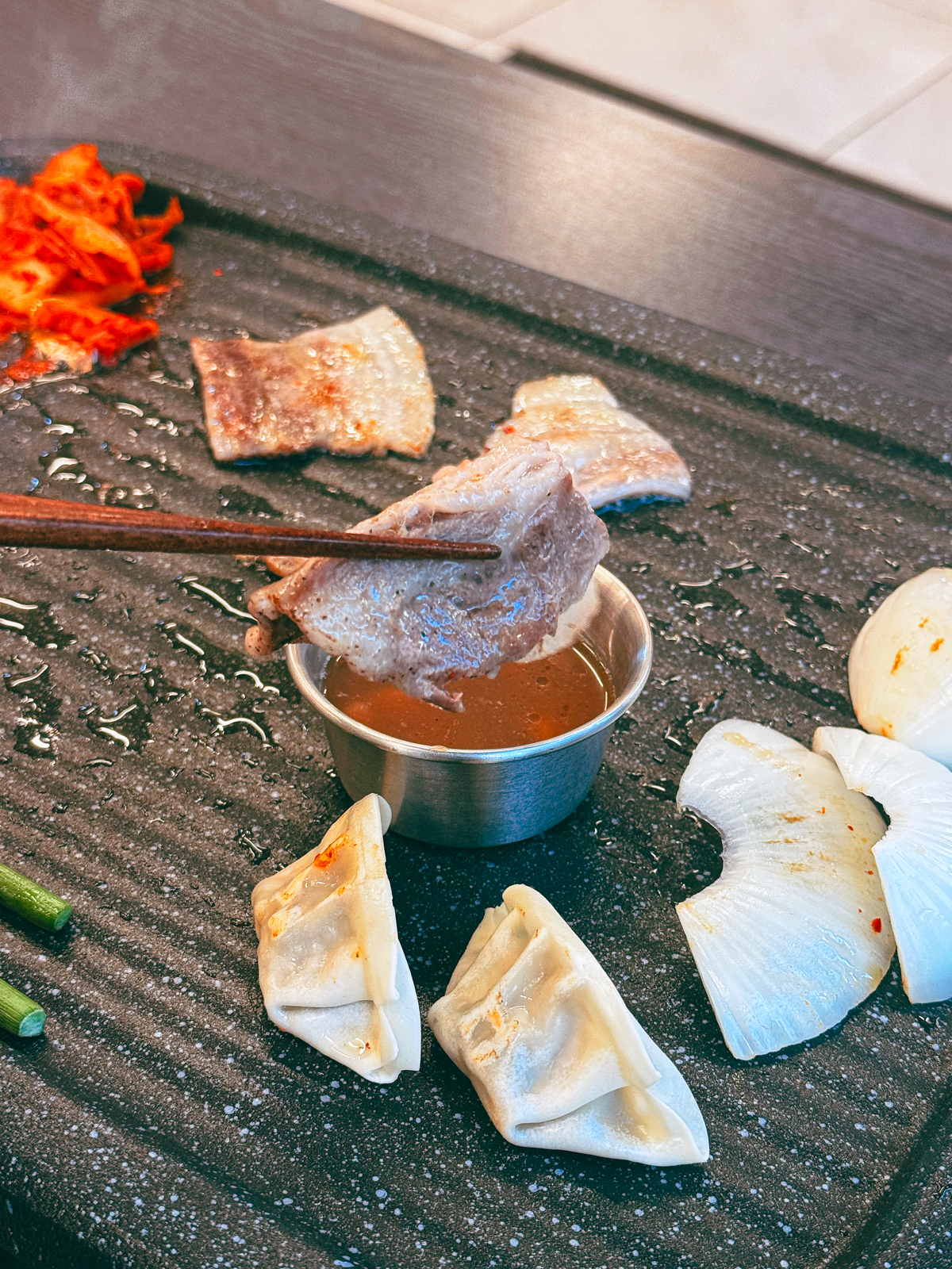 불판은 1단에서 2단으로 맞춘 후 주문했던 흑돼지 냉삼과 함께 마늘쫑, 만두, 콩나물, 배추김치, 양파를 올려 구워준다. 냉동삼겹살 기름이 흘러내리는 곳에 김치와 콩나물을 두어야 더욱 맛있게 먹을 수 있으며, 얇은 고기인 만큼 빠르게 익혀지기에 먹을 만큼만 구워주는 게 포인트다.