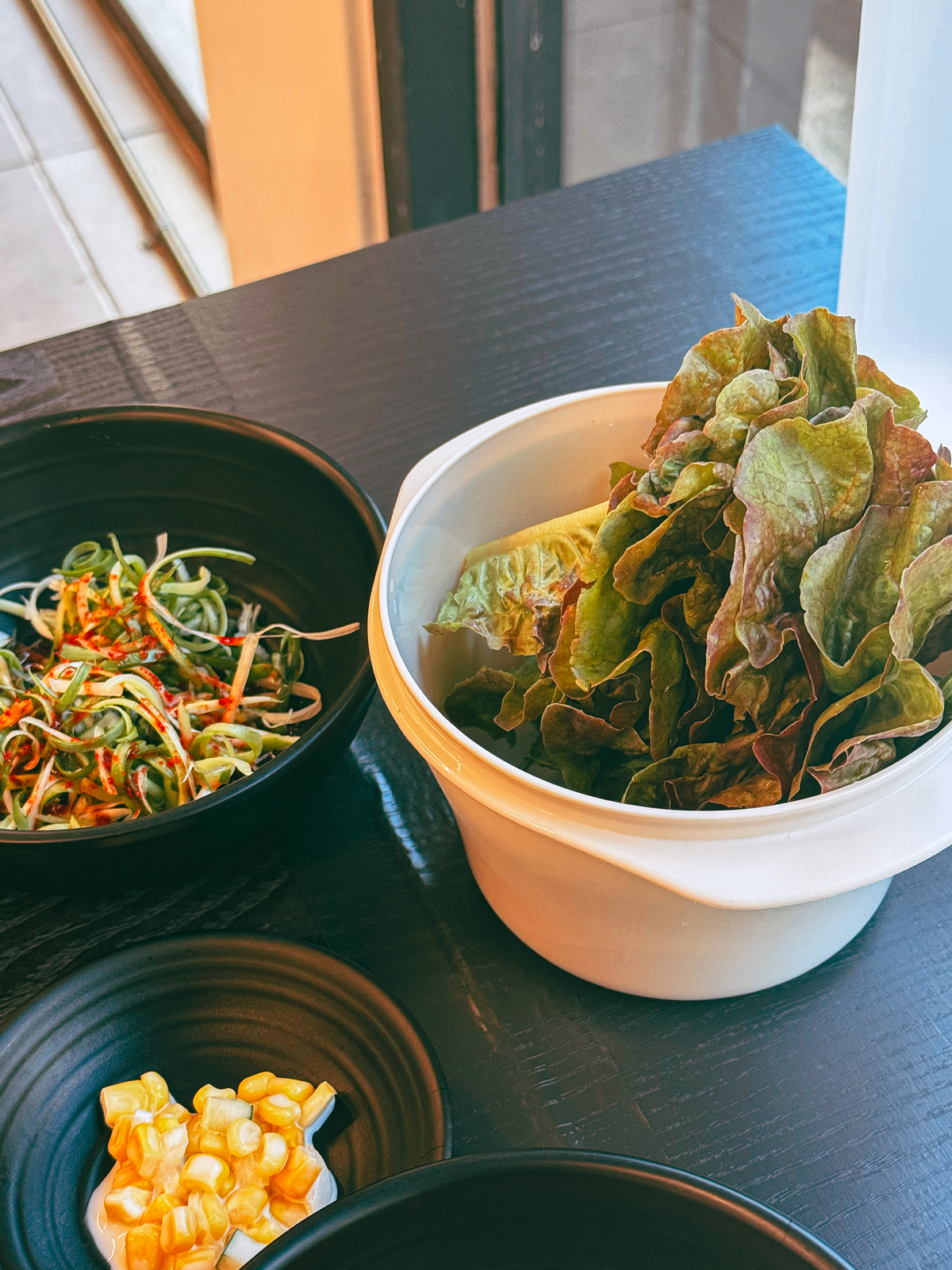 밑반찬도 다양하게 푸짐하게 식사할 수 있는 냉삼뷰는 셀프코너를 통해 원하는 만큼 반찬을 가져다가 먹을 수 있다. 아삭아삭하면서 서매콤한 김치, 콩나물은 물론 파채, 양파절임과 상추쌈까지 마련되어 있었다.