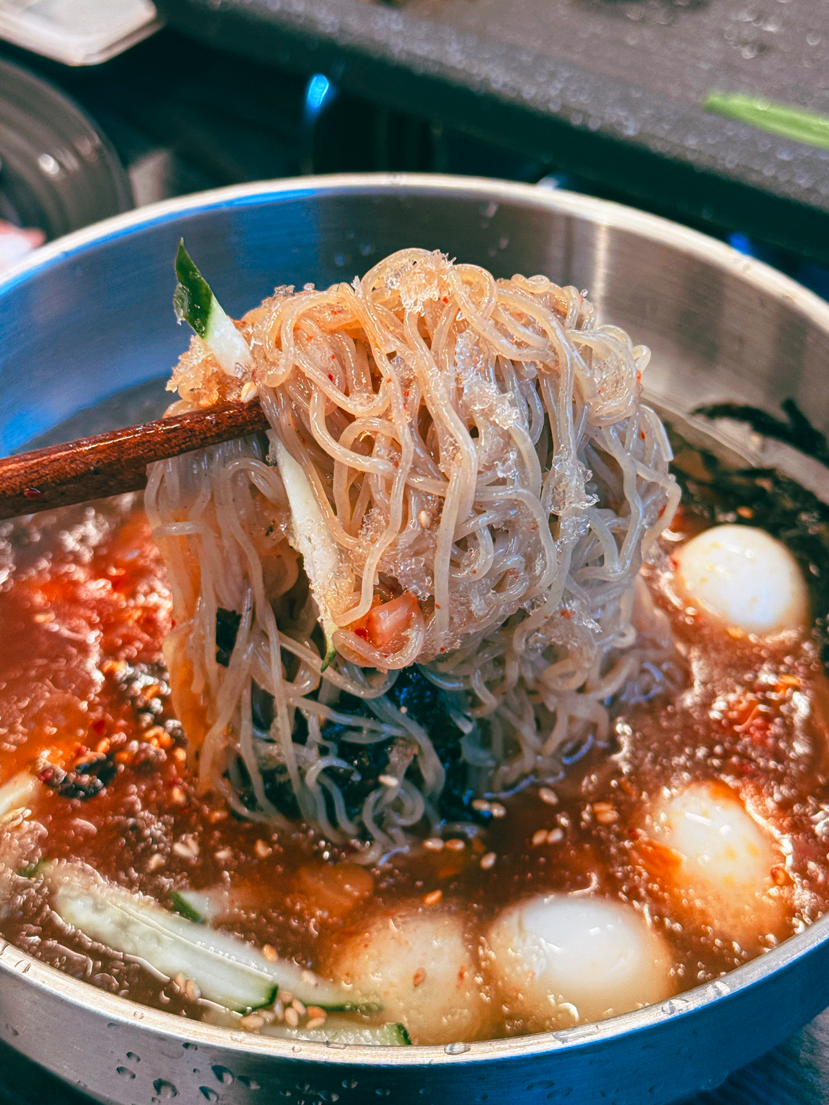 메뉴 이름처럼 시원하면서 새콤한 맛이 감도는데 면발은 숟가락으로 떠먹을 수 있게 가위로 여러 번 자르면 더욱 맛있게 먹을 수 있다.