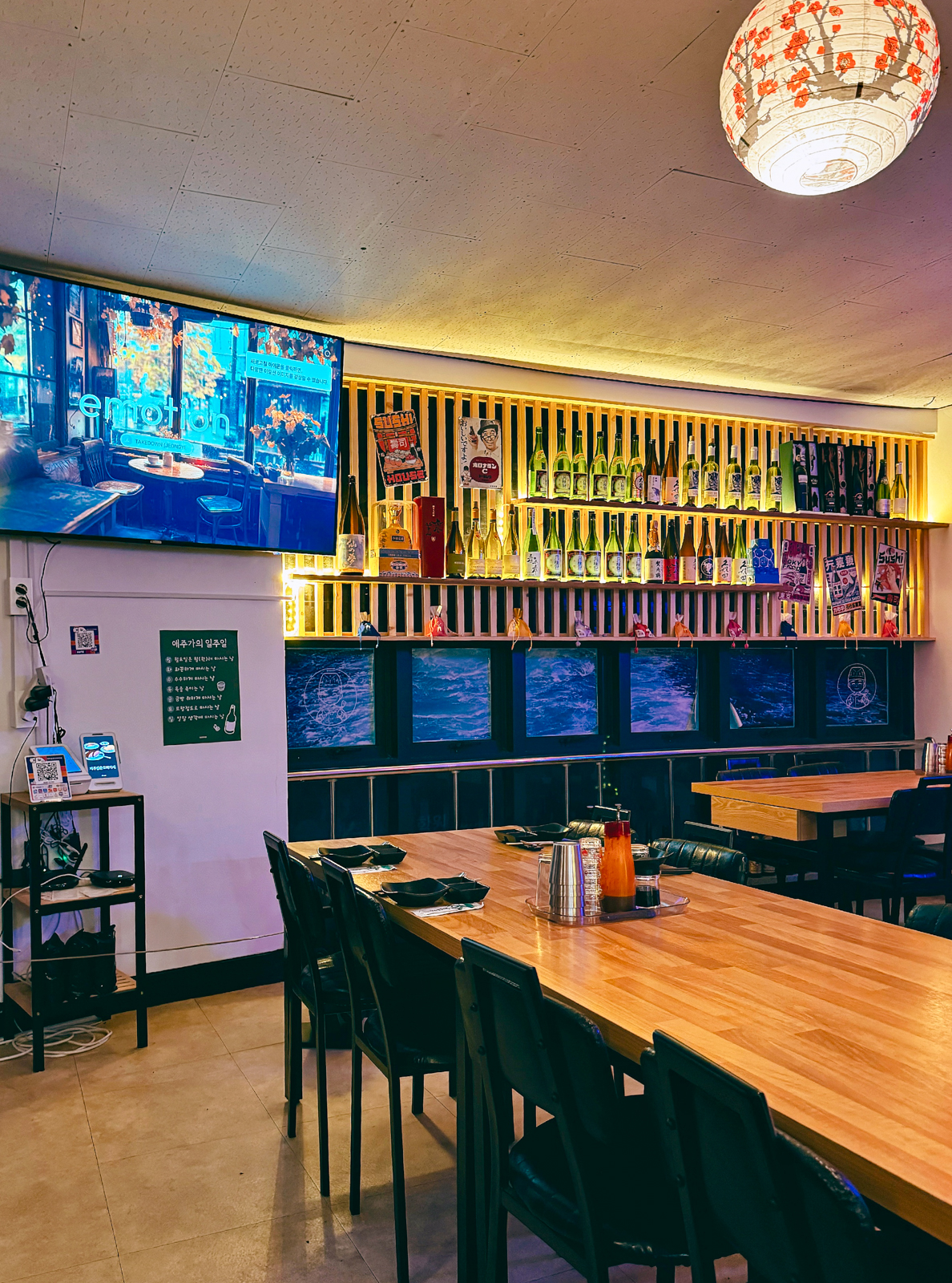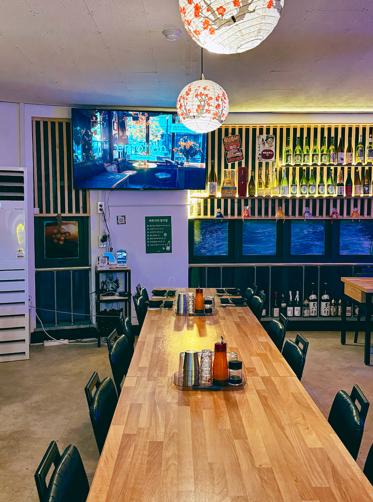 제주 오마카세 맛집 탑동 제주삼춘은 전체적으로 시원한 내부 공간에 여러 명이 앉을 수 있는 대형 테이블이 마련되어 있으며 대형 TV 옆에 여러 종류의 사케가 진열되어 있어 들어가는 순간부터 눈길을 사로잡았다.