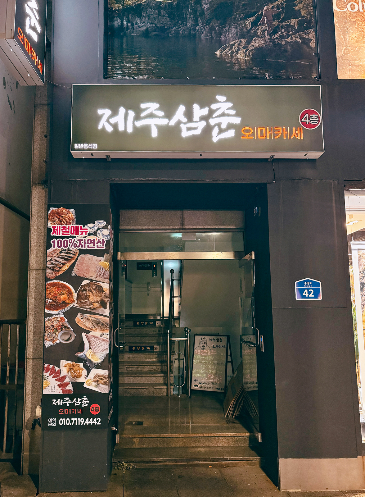 1인 기준 5만원에 부채새우를 포함하여 다양한 요리를 맛볼 수 있는 제주삼춘 오마카세는 제주시 중앙로 사거리에서 탑동광장으로 가기 전 보이는 칠성로 대도로변, 성안올레 2코스 근처에 위치해 있다.