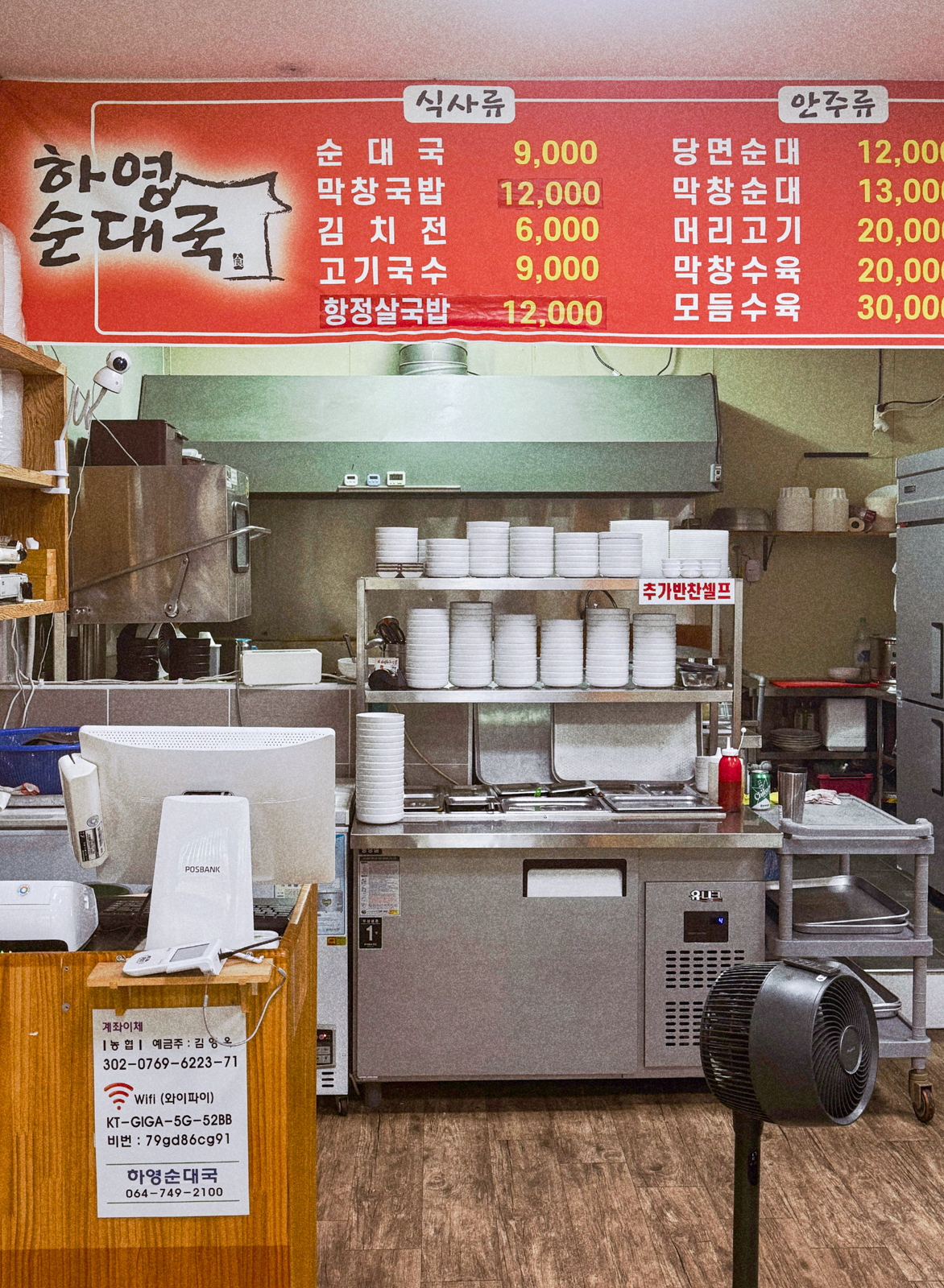 전용주차장이 있어 차를 타고 가기에도 편리했던 이곳은 순대국, 막창국밥, 항정국밥, 김치전, 고기국수, 당면순대, 막창순대, 머릿고기, 막창수육, 모듬수육과 함께 제주쌀막거리를 곁들일 수 있어 인근 현지인이 많이 차고 있었다.
