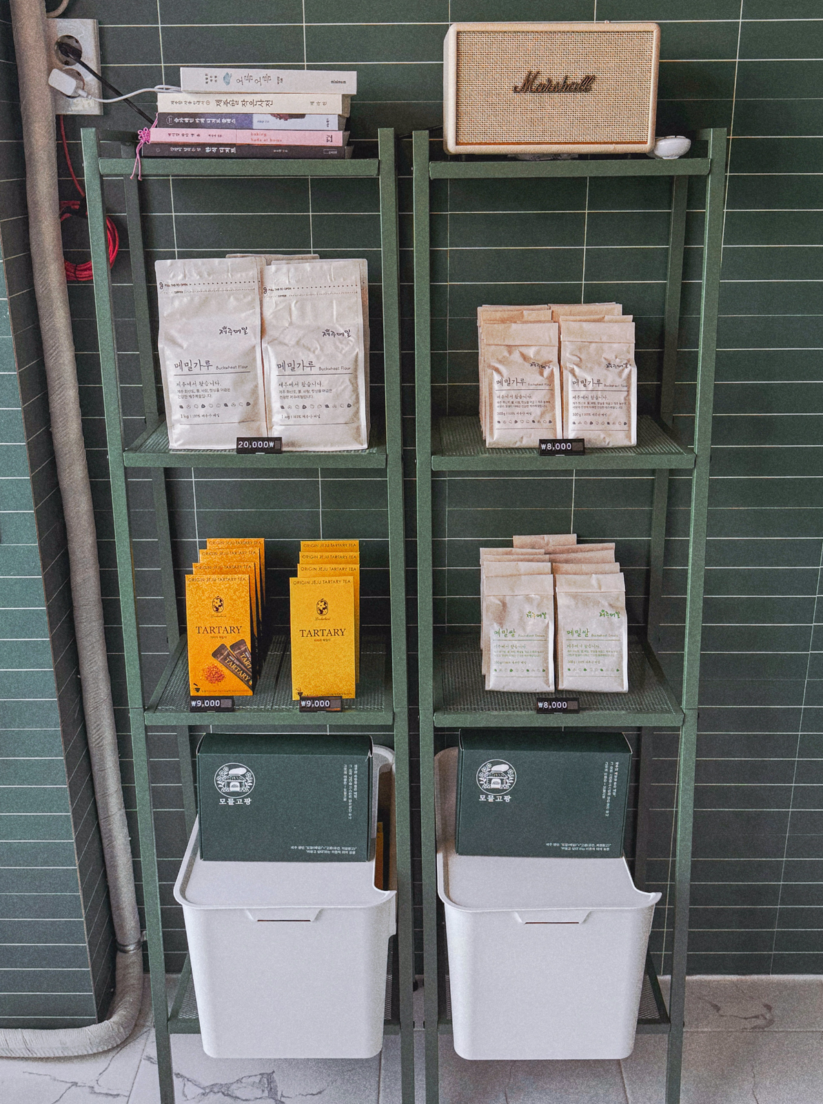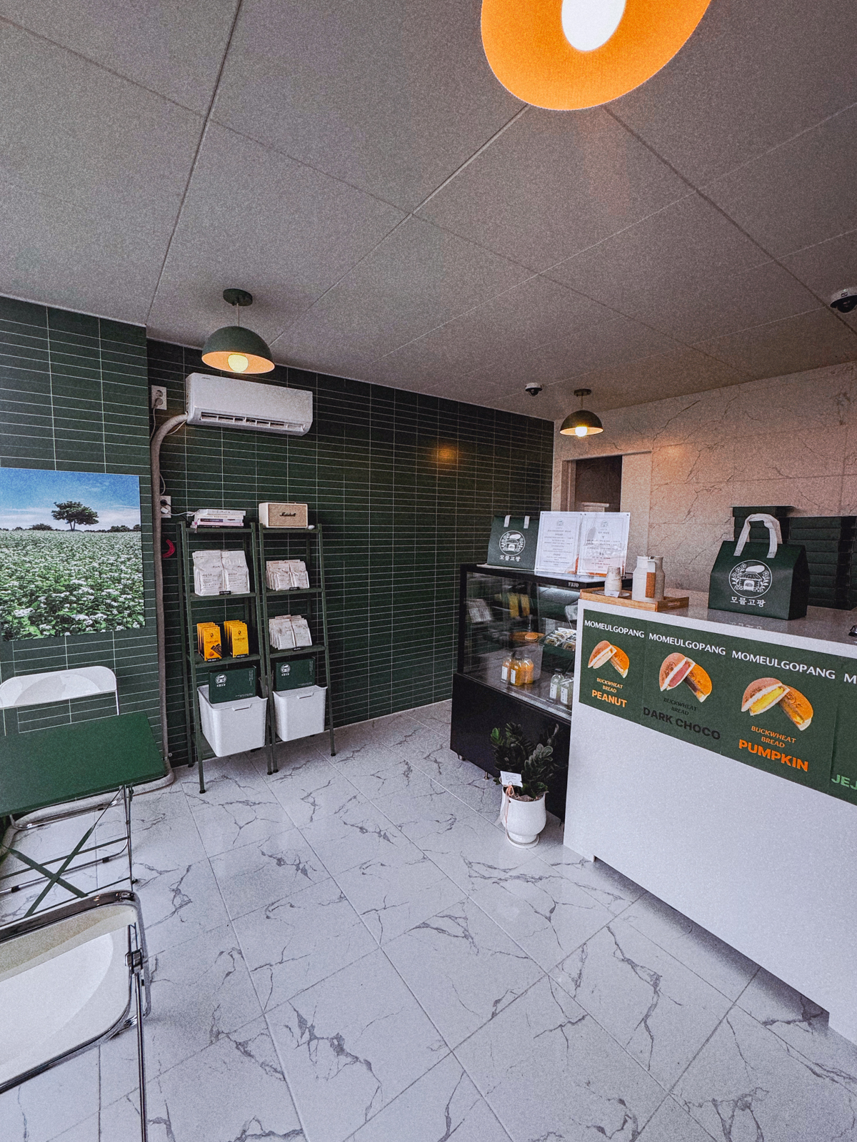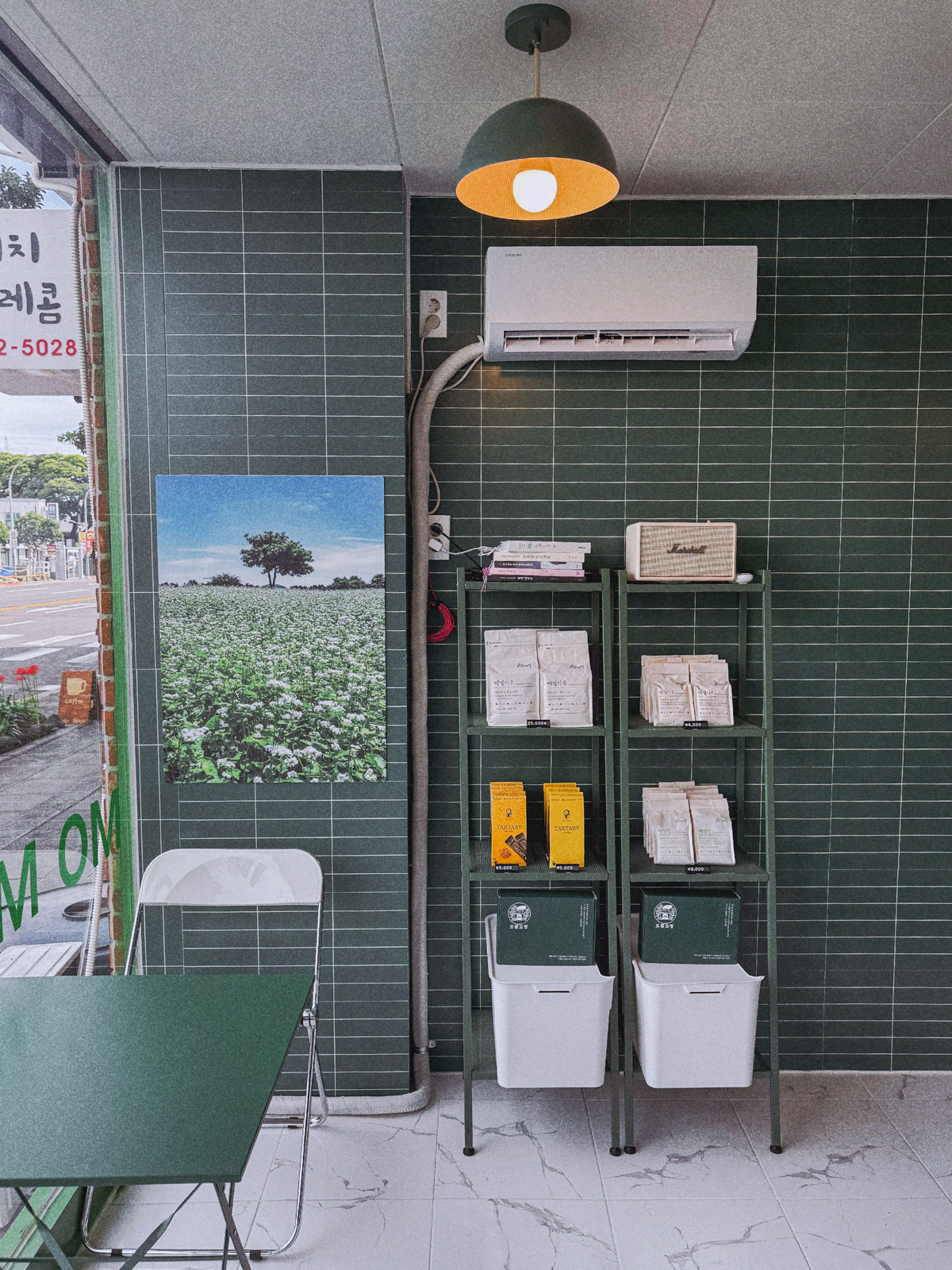 제주 선물가게 모믈고팡으로 들어가면 눈이 편해지는 녹색 계열 바탕에 화이트톤으로 내부가 꾸며져 있었으며 메밀을 전문으로 하는 베이커리답게 한쪽 벽면에 메밑밭 풍경을 담은 액자가 시선을 사로잡았다.