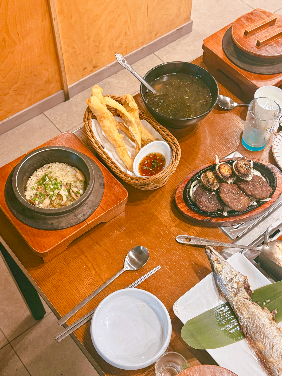 솥밥 속에는 전복이 푸짐하게 들어 있으며 빈그릇에 담은 후 테이블에 마련된 온수를 넣어 누룽지 숭늉도 먹을 수 있다. 참고로 숭늉은 소화에 도움되는 효소 성분이 많기에 배부르게 식사를 해도 위에 부담을 주지 않는다.