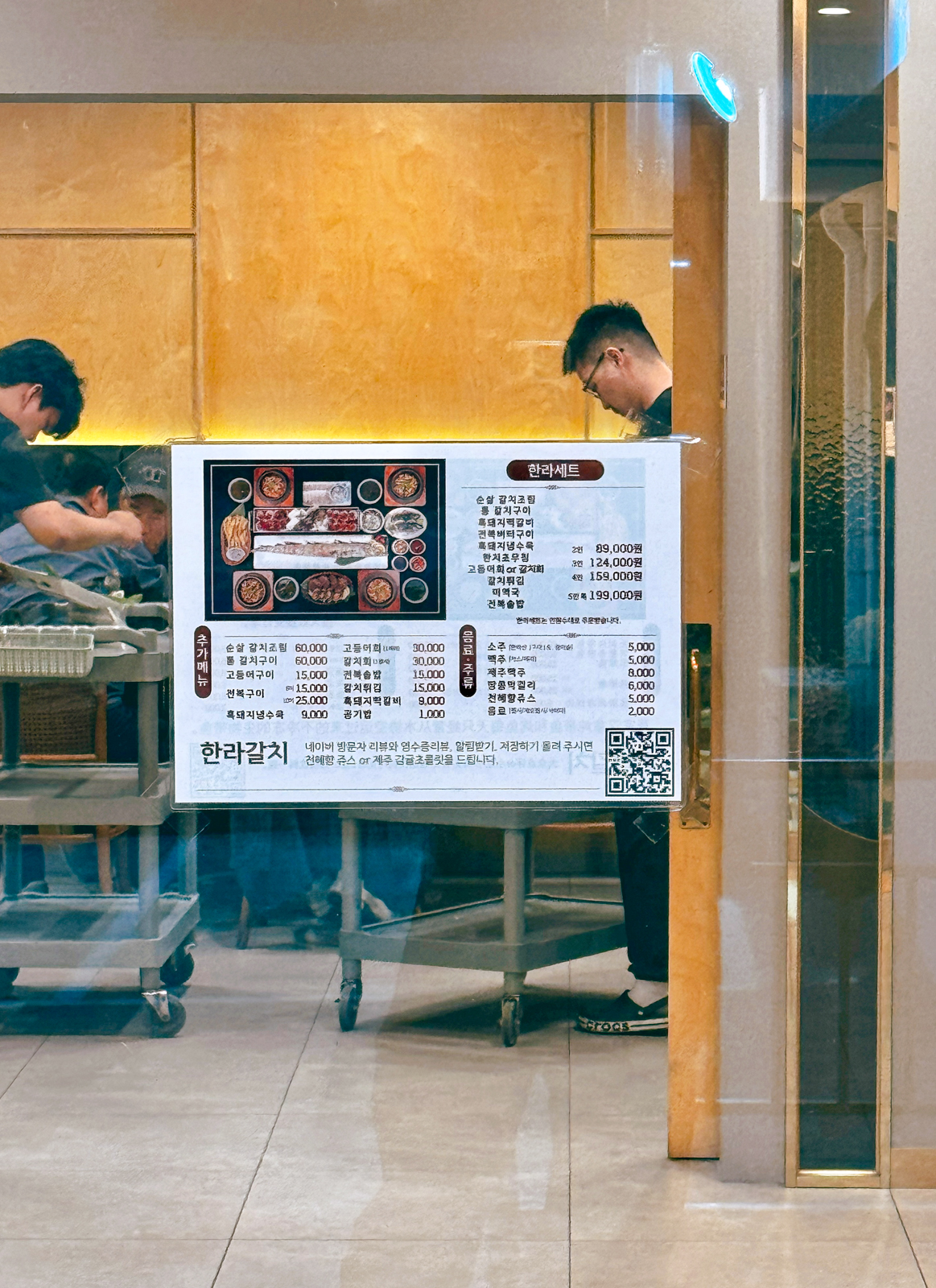 제주 갈치조림, 통갈치구이를 먹기 위해 지인과의 약속 시간에 맞춰 내부로 들어가는 길에는 이곳에서 주문할 수 있는 메뉴와 가격표가 상세하게 안내되어 있으며, 한쪽 벽면으로는 여러 BJ, 연예인 등 사인을 만나볼 수 있었다.