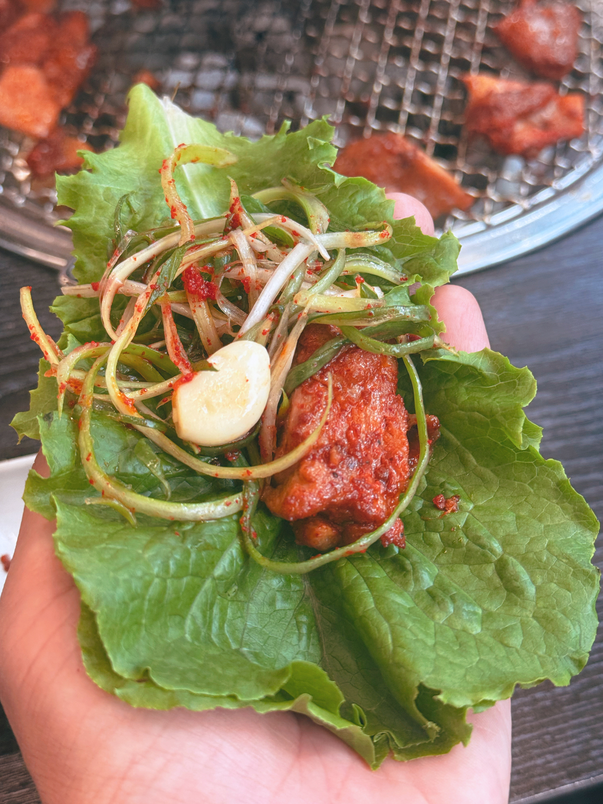 다 구워진 닭갈비는 밑반찬과 함께 나온 겨자소스나 매운소스에 찍어먹거나 상추삼에 파채, 마늘, 된장을 함께 넣어 먹으면 되는데 계속해서 먹게 만드는 중독성을 자랑해 제주 노형 한라대학교 맛집인 이유에 대해 공감이 절로 갔다.