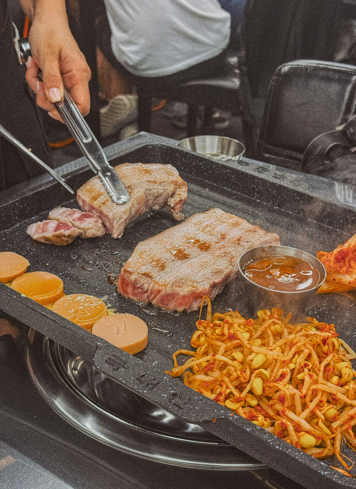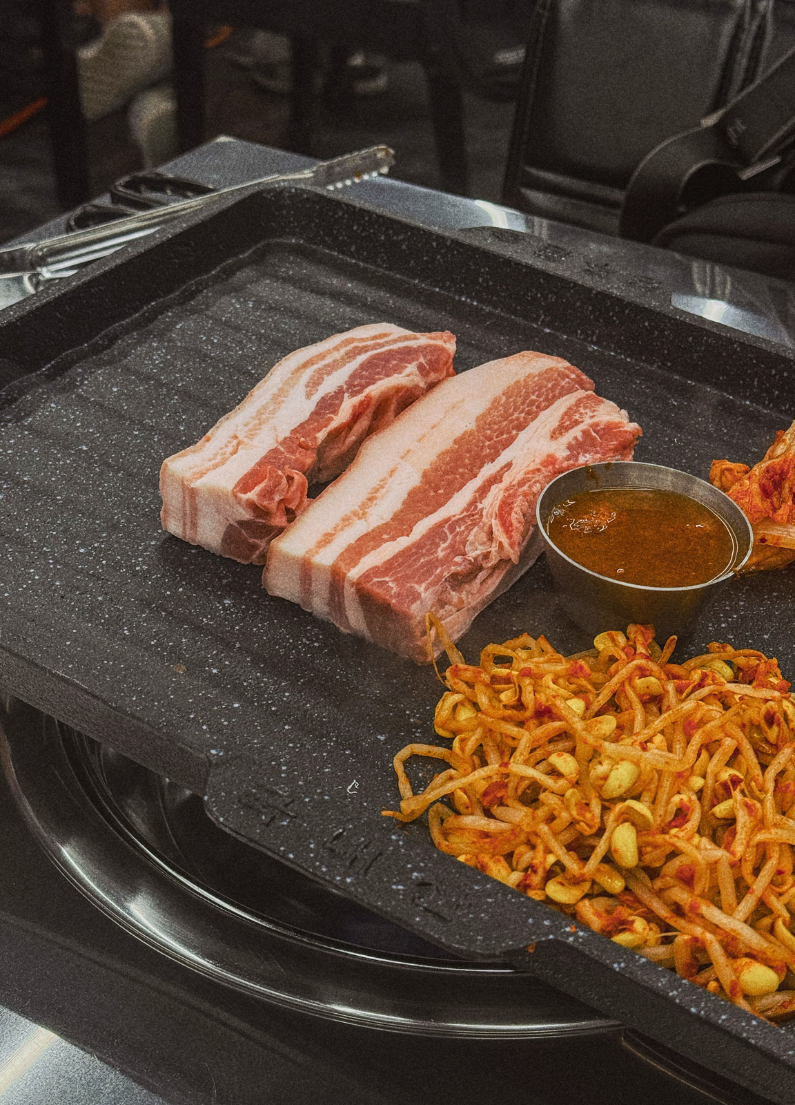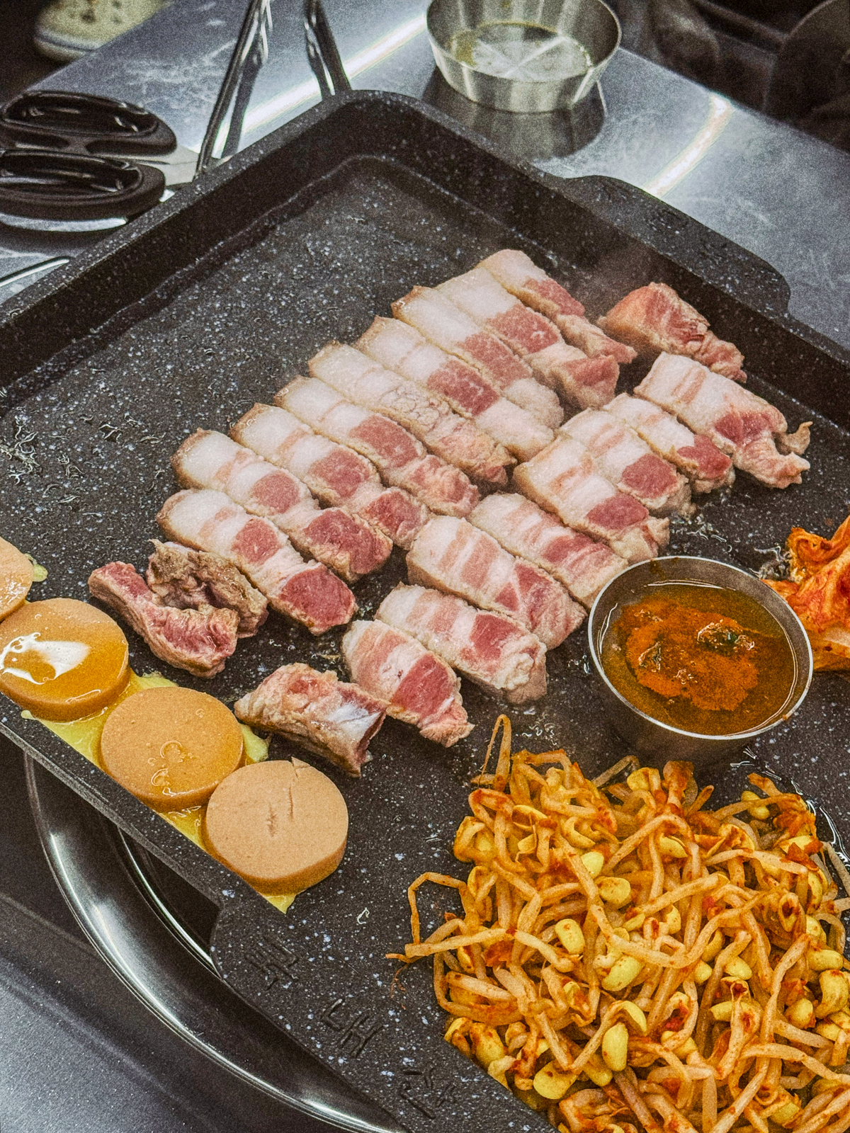 180g 기준 가격 20,000원인 흑돼지 오겹살을 주문하면 불판에 고기, 콩나물, 김치, 계란 입힌 옛날 소세지를 올려 직원이 직접 구워줘서 먹기가 편했고, 다양한 밑반찬과 함께 육회, 찌개가 함께 나온다.
