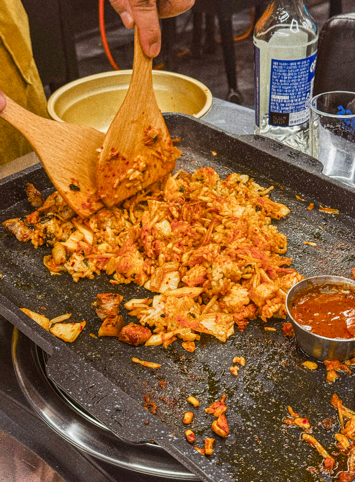 제주 현지인 추천 맛집 연동 금돈상회에서 고기를 어느정도 먹고난 후에는 직원에게 요청해 방문자리뷰 작성 서비스로 받을 수 있는 볶음밥을 요청하면 불판에다가 직접 볶아주는데, 흑돼지 기름이 가미된 음식인 만큼 계속해서 떠먹게 만드는 중독성을 자랑한다.