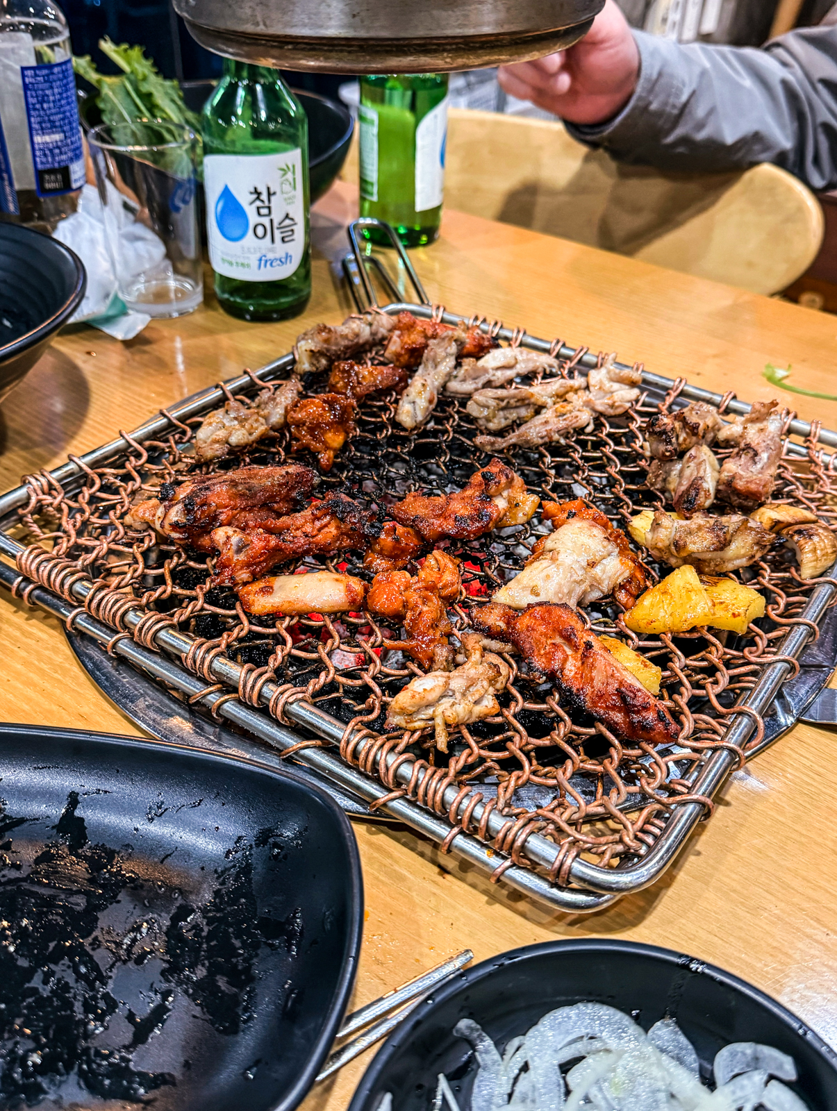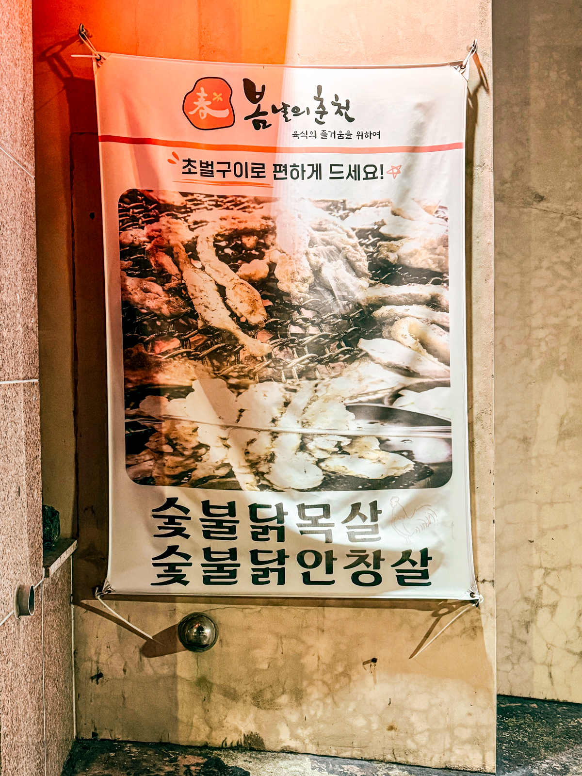 이곳은 초벌 숯불닭갈비 전문점으로 강원특별자치도 춘천시에서 이주한 사장님이 운영한다. 닭목살, 닭안창살, 무뼈닭발, 닭똥집, 국물닭발, 막국수, 라면, 주먹밥, 찌개 등 다양한 메뉴가 있어 포장 배달 및 가족 외식을 하러 찾아온 현지인으로 붐볐다.