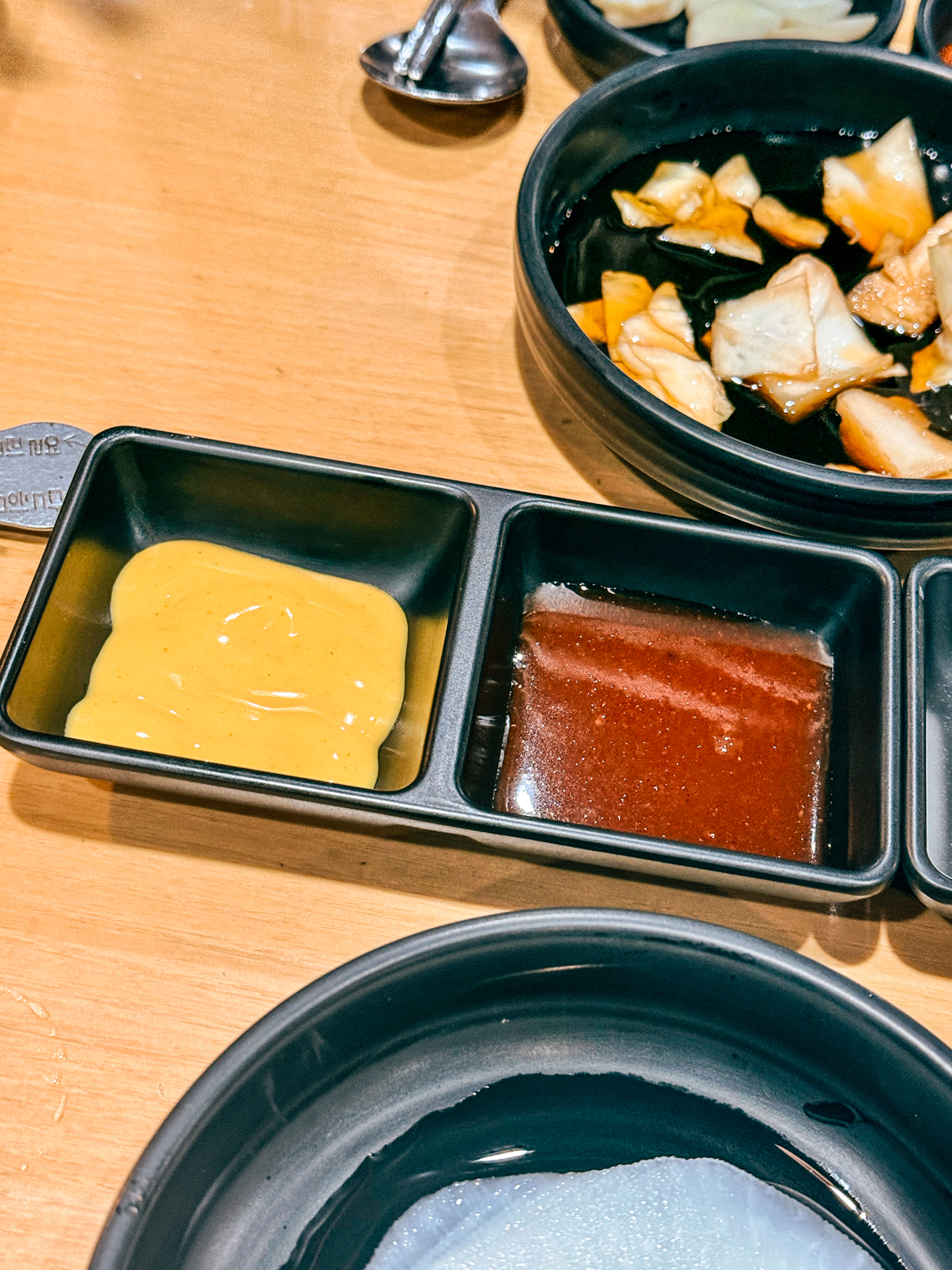 봄날의춘천에서는 머스타드, 양념소스와 함께 직접 개발한 마늘+레몬 소스와 소금이 있으며 기호에 따라 구워진 숯불닭갈비를 소스에 찍고 상추와 깻잎쌈에다가 올린 후 마늘이나 양파지를 넣어 먹으면 입안 가득 제대로 된 풍미를 한껏 느낄 수 있다.