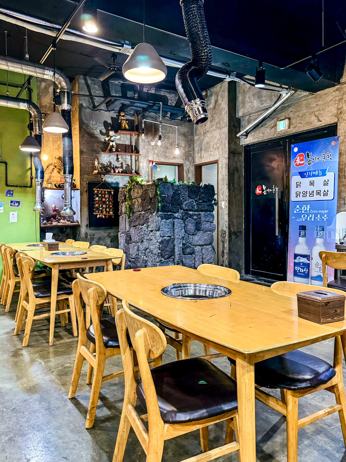 내부는 제주 숯불닭갈비를 편하게 먹을 수 있는 테이블이 여러 개 마련되어 있으며 좌식 테이블까지 포함한다면 단체로 가도 될 정도의 규모를 자랑한다.
