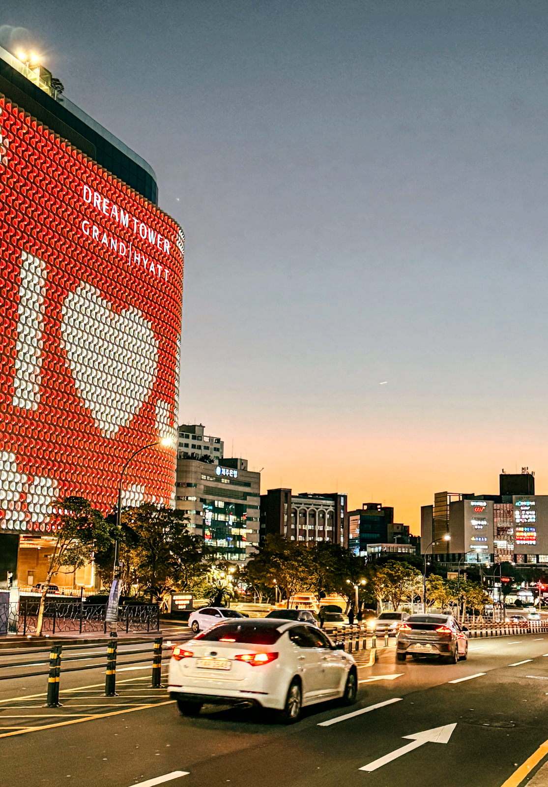 저녁식사로 지인과 함께 숯불닭갈비와 막국수를 먹으러 가는 길, 제주공항에서 차로 약 10분이면 갈 수 있는 제주 드림타워 그랜드하얏트 호텔은 오후 6시 무렵부터 일몰 풍경을 볼 수 있었다.