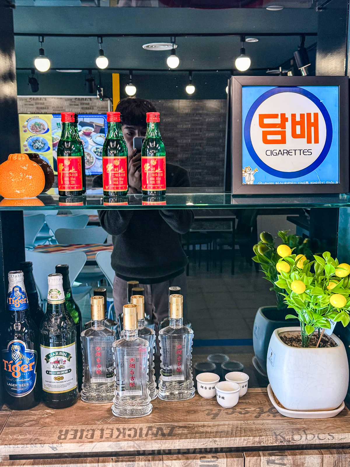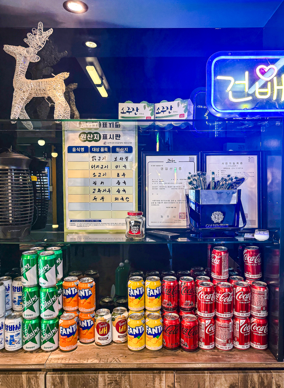 제주 쌀국수 맛집에 방문했던 날에 앉았던 테이블 옆에는 이곳에서 만든 요리에 대한 원산지 목록이 상세하게 안내되어 있으며 여러 종류의 맥주, 음료수부터 연태고량주까지 깔끔하게 진열되어 있었고 냉장고에도 가득 채워져 있다.
