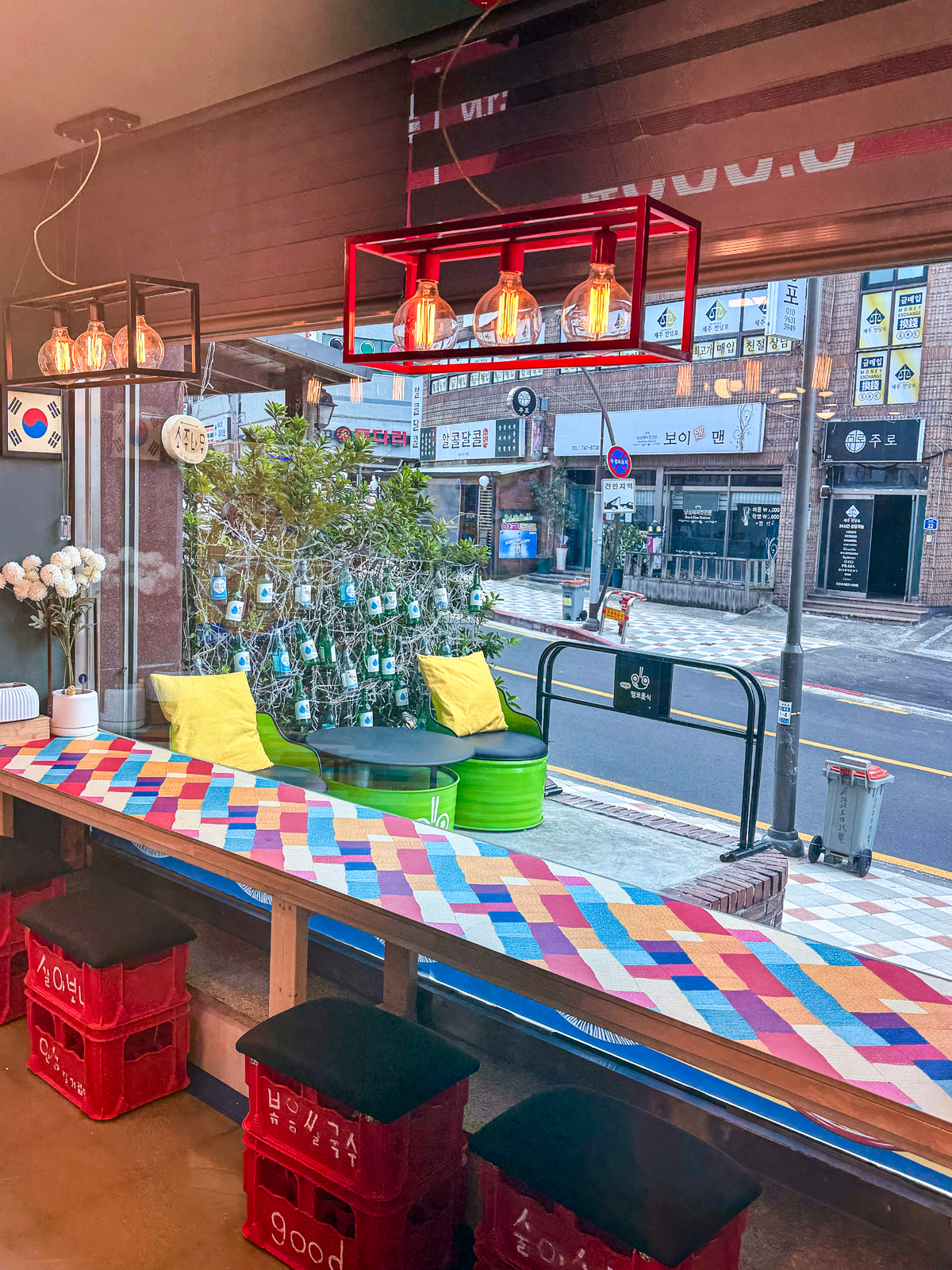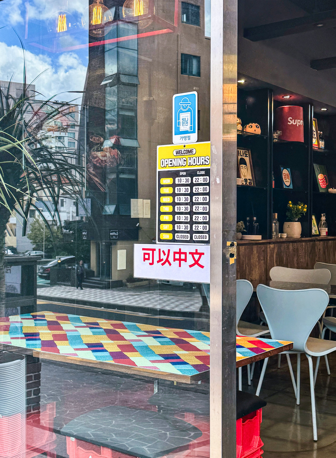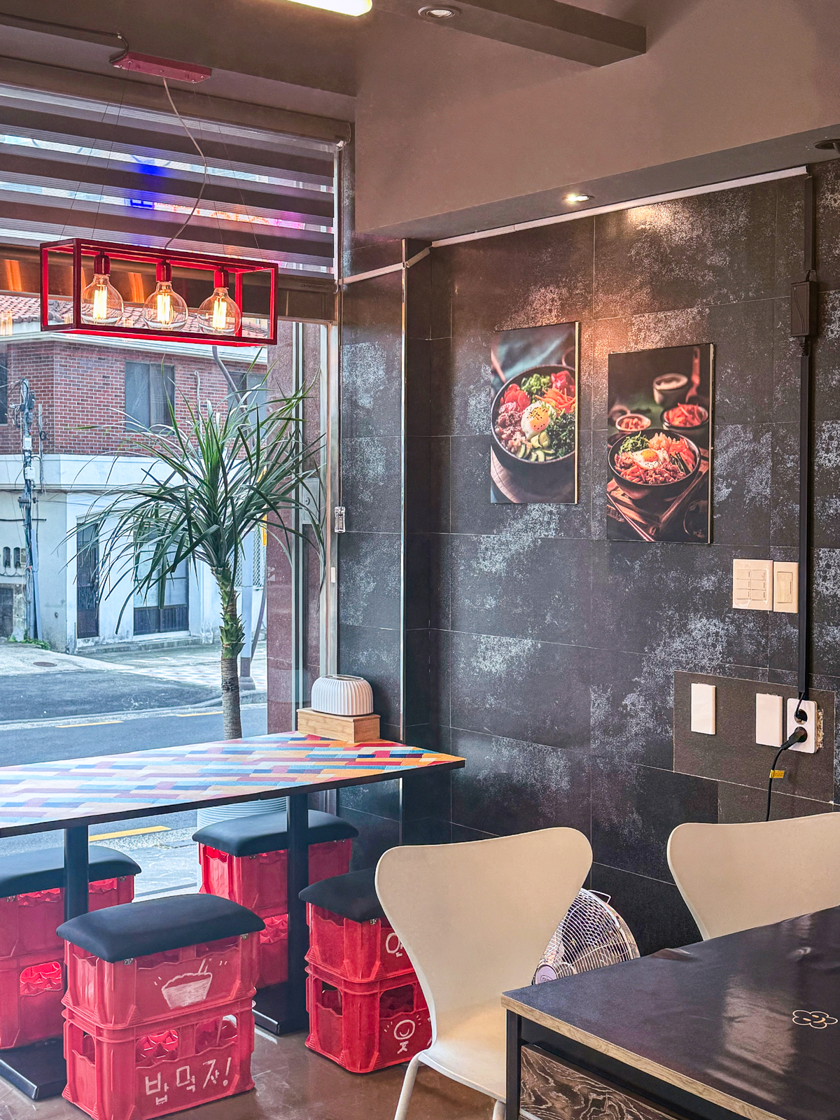 제주 쌀국수 맛집 노형 후난면가 헬로미식으로 들어가면 전체적으로 중국풍 인테리어로 꾸며져 있으며 혼밥 혹은 2~4인이 앉을 수 있는 사각 테이블과 함께 야외 경치를 바라보며 식사할 수 있는 바 테이블이 마련되어 있다.