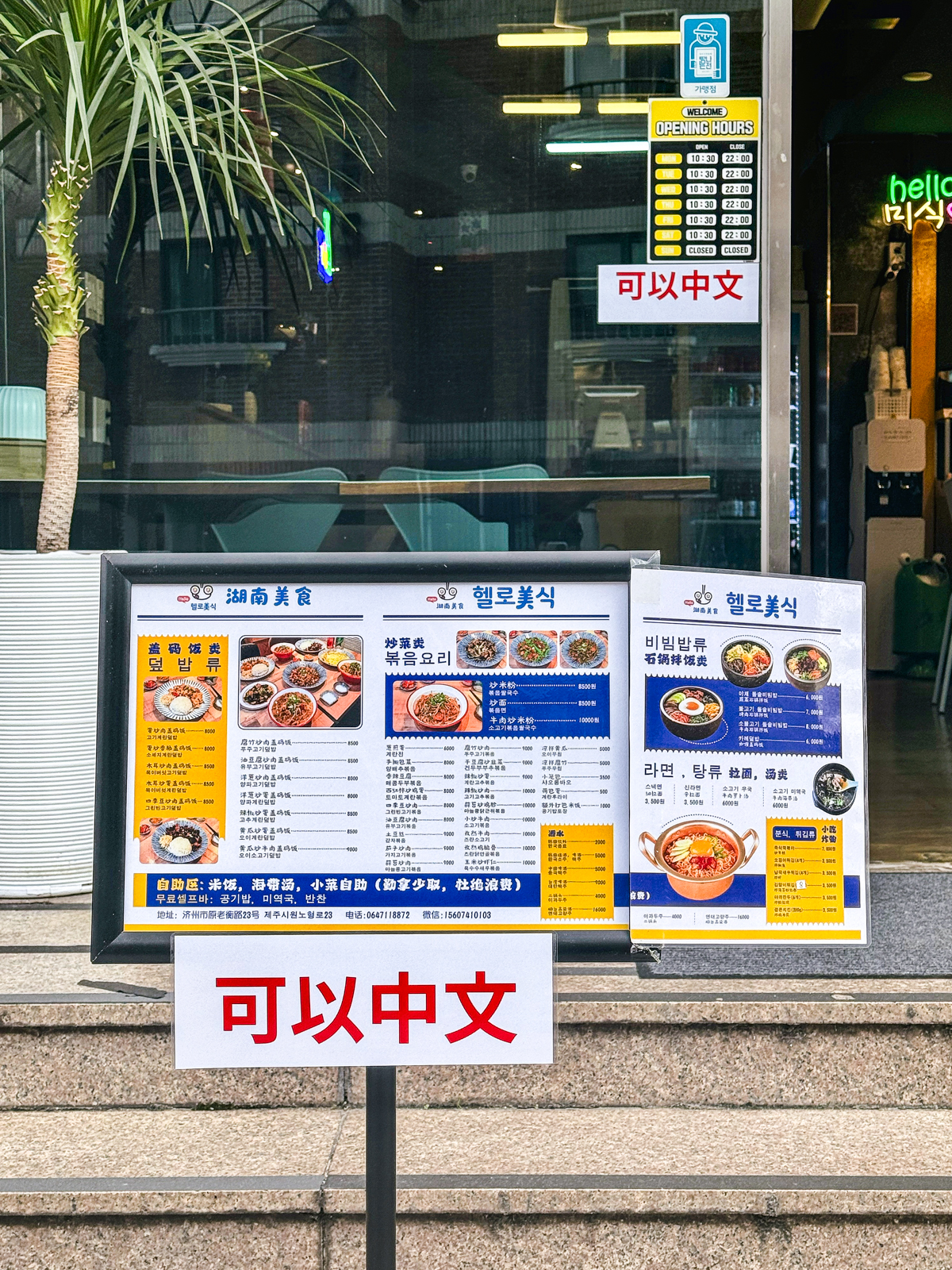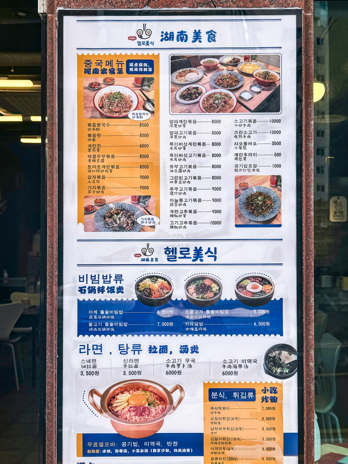 제주 후난면가 헬로미식 입구 앞에는 이곳에서 주문할 수 있는 메뉴와 함께 가격표가 상세하게 안내되어 있다. 중국식으로 만든 쌀국수, 볶음면, 계란전, 매콤두부볶음, 토마토계란볶음, 감자볶음, 가지볶음 등이 메인요리다.