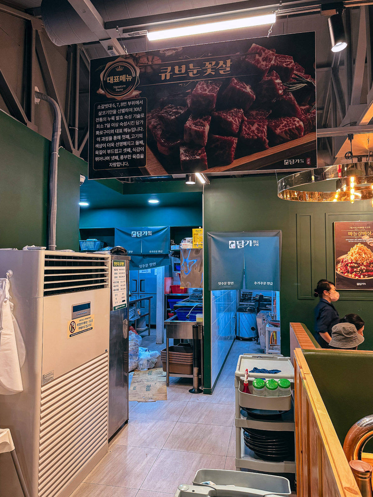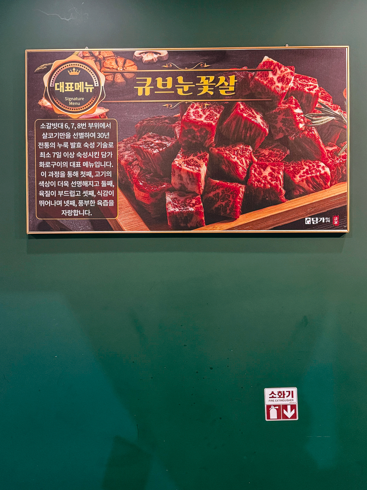 제주 담가화로구이에서는 대표메뉴로 큐브 눈꽃살, 마늘갈비살, 이베리코 돼지고기가 있으며, 매장 내부에는 각 부위마다 특징 및 설명이 사진과 글로 상세히 안내되어 있었다.