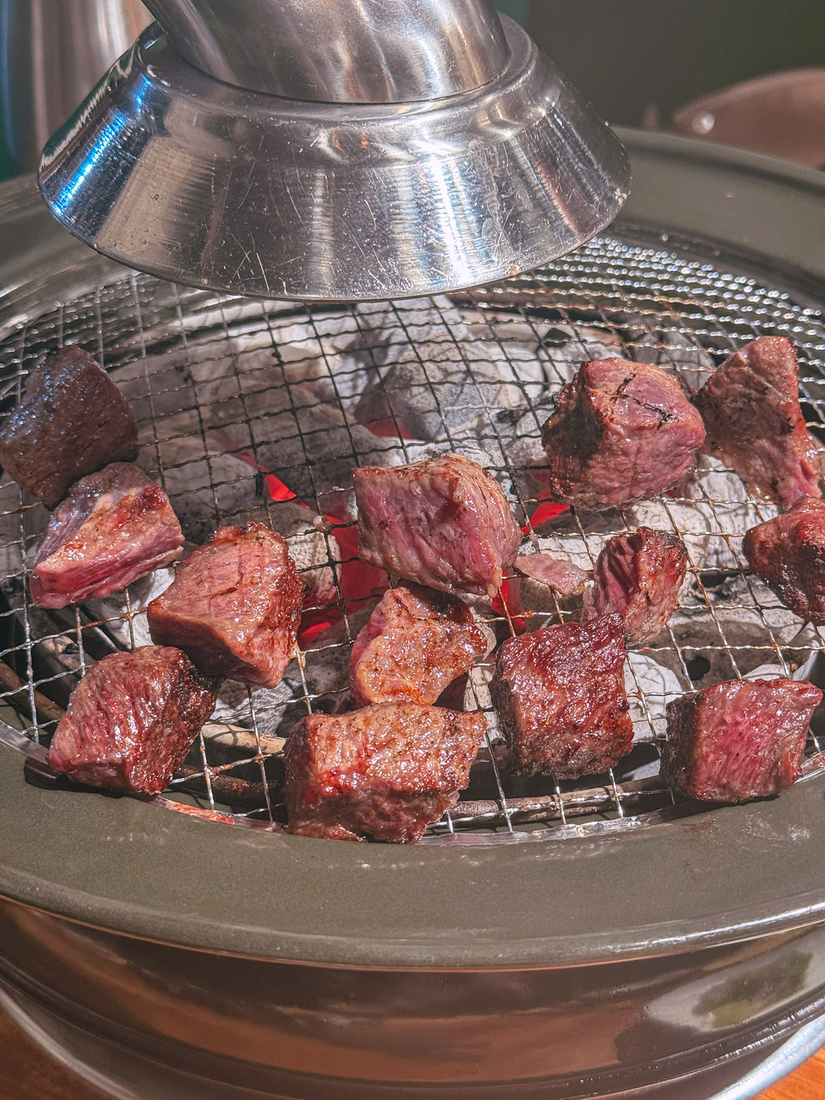 400g 기준 가격 69,000원짜리 큐브 눈꽃살 소고기와 함께 숯불이 올려지고 불판 위에다가 고기를 올렸다. 일반 소고기보다 두툼한 근고기이지만 숯불의 화력으로 금방 구울 수 있었다.