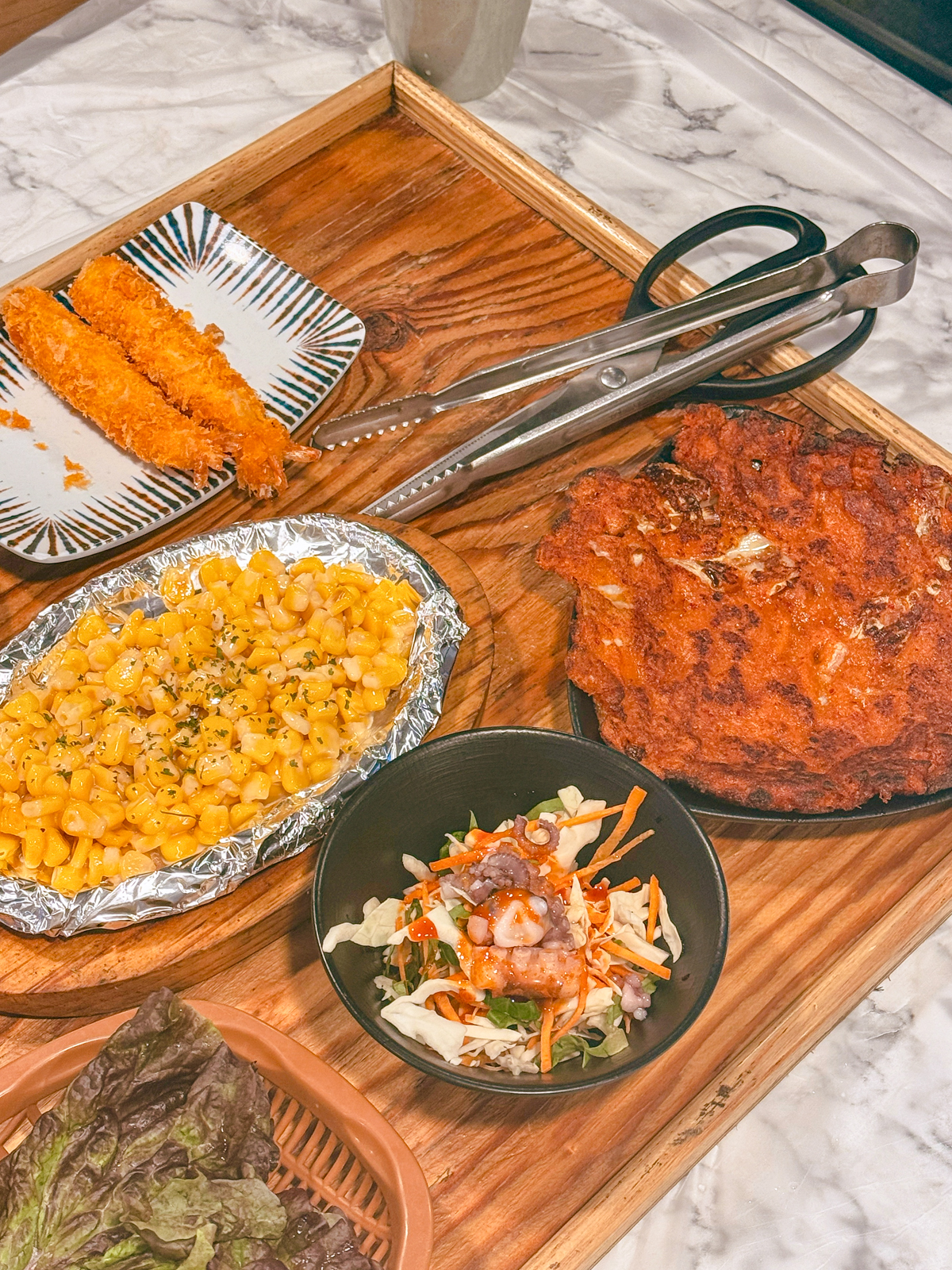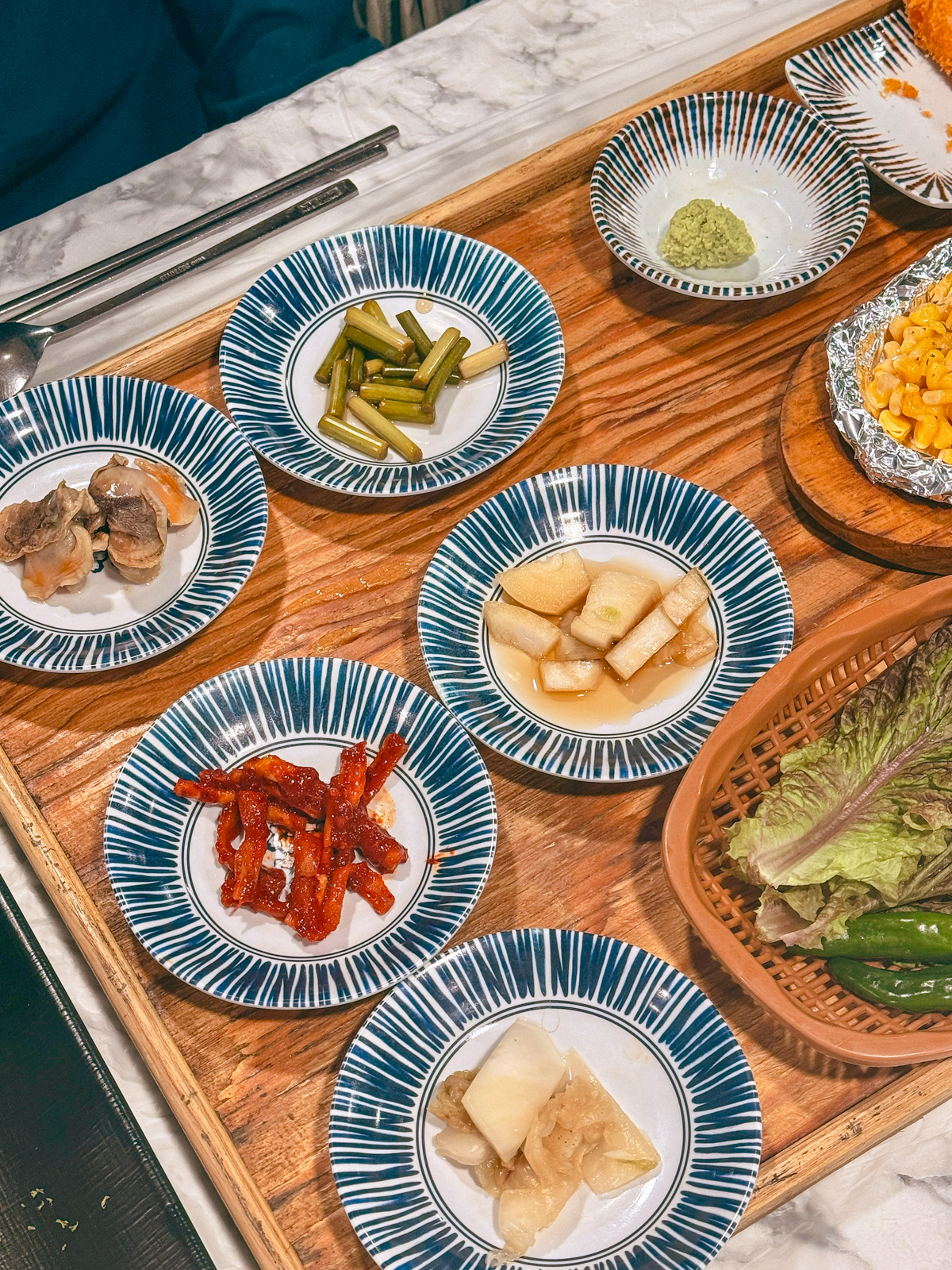 제주도 횟집 맛집 현지인 추천 용마횟집에 가서 코스요리를 주문하고 기다리면 직원 분이 직접 여러 반찬부터 가져다준다. 김치전, 새우튀김, 꼬막무침, 새우장, 백김치, 마늘쫑, 콘옥수수 등 푸짐하게 나와 전체적으로 가성비가 좋았다.