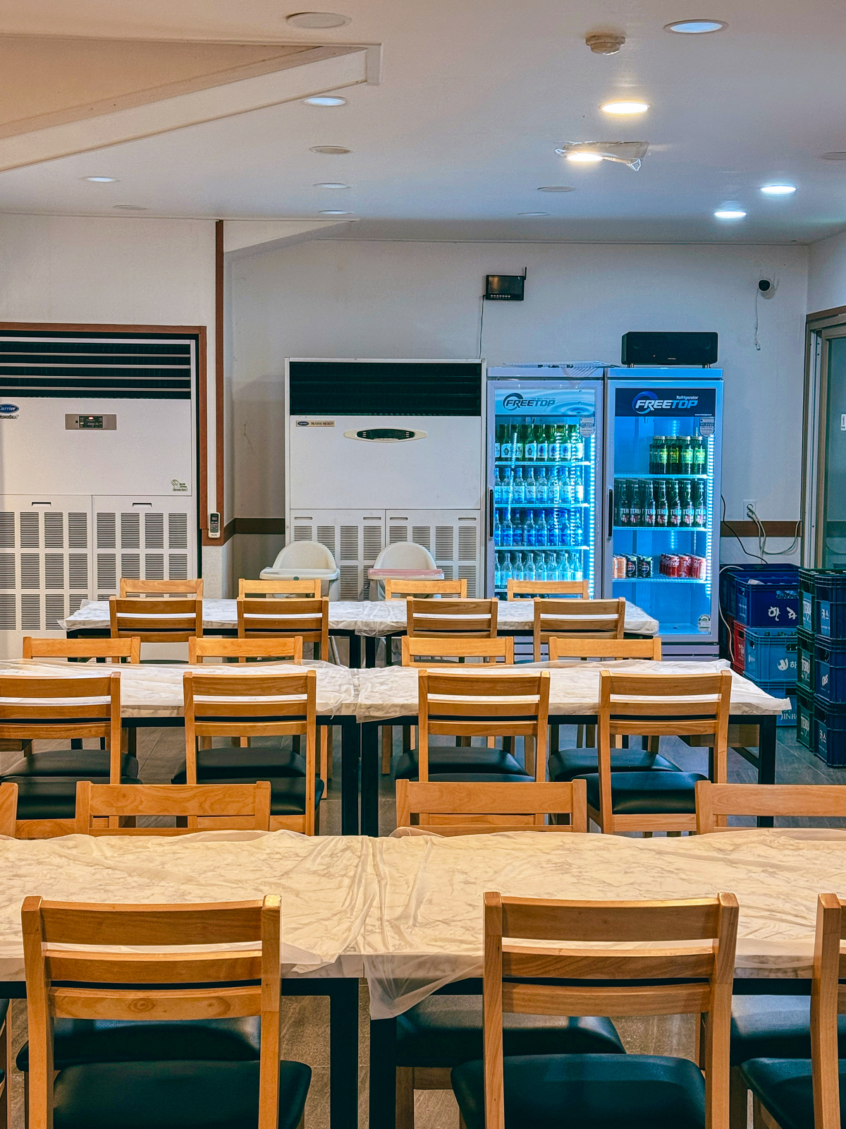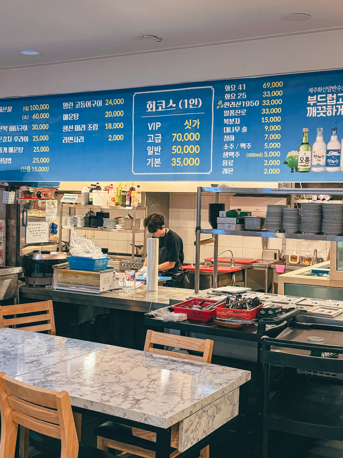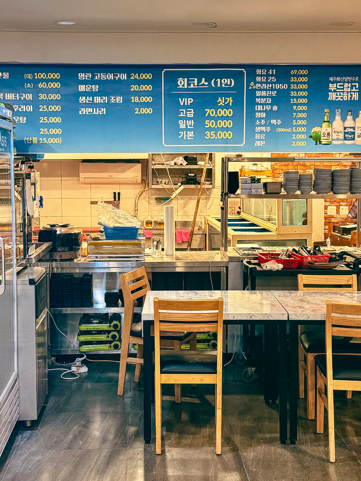 제주 용담해안도로 맛집 용마횟집 외부 계단을 따라 2층으로 올라가면 넓은 내부 공간에 여러 명이 함께 앉아 회를 먹을 수 있는 테이블이 마련되어 있으며 오픈한 지 얼마 되지 않은 곳답게 전체적으로 깨끗하게 관리되어 있었다.