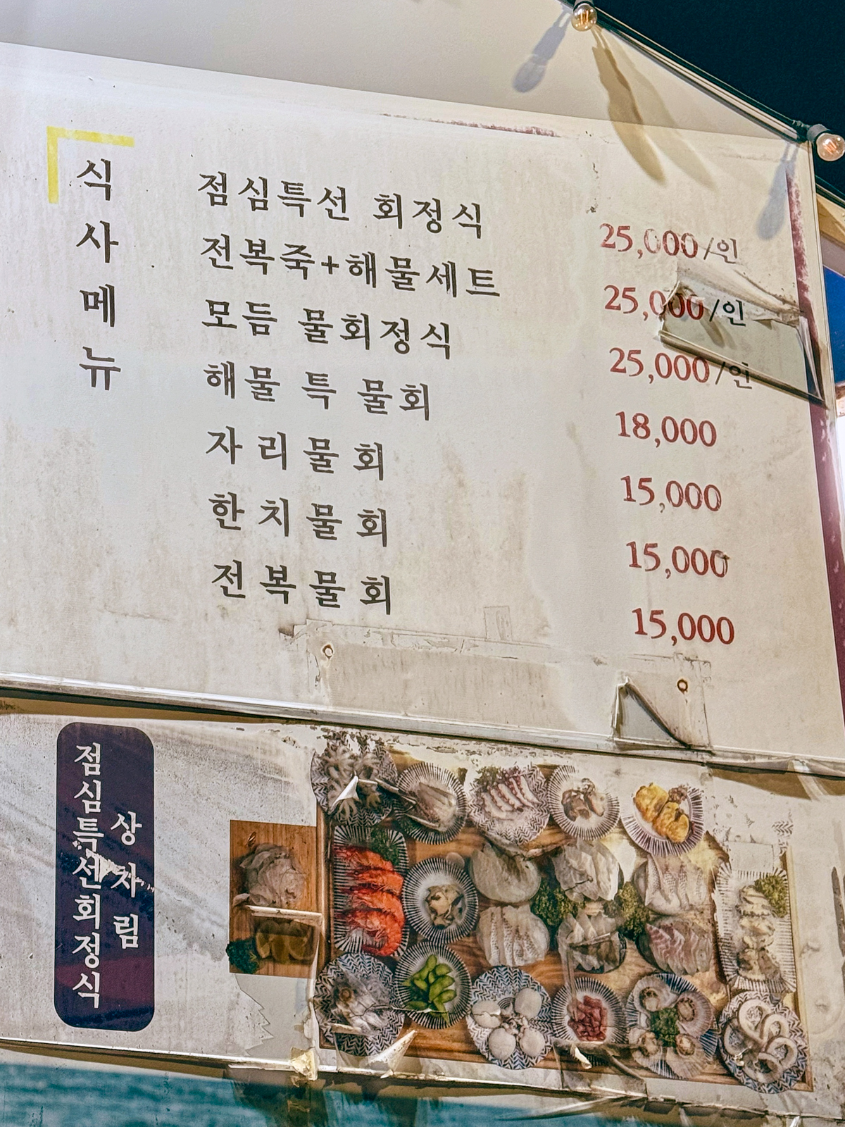 이곳은 낮 시간에는 바다가 보이는 오션뷰 전망을 자랑하며 내부 공간이 넓어 여러 명이 함께 가기에도 좋으며, 점심 특선을 통해 1인 25,000원 가격으로 회정식까지 먹을 수 있기에 제주도 횟집 맛집 현지인 추천 장소를 찾는다면 추천하고 싶다.