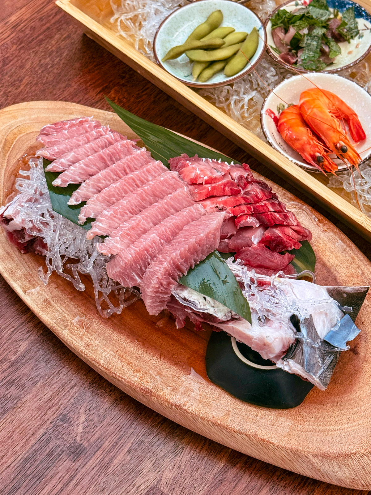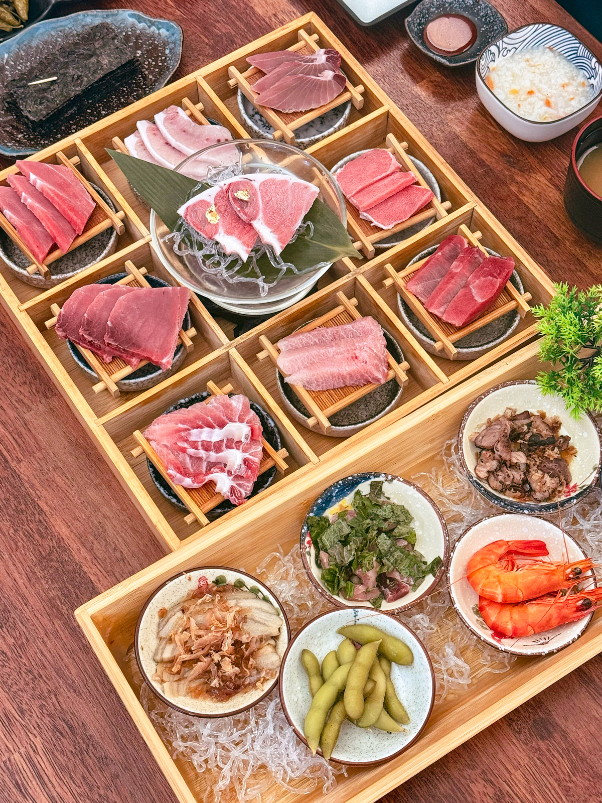 두툼한 크기의 참다랑어, 황새치, 눈다랑어를 직접 떠서 나오는 총 아홉 가지 참치회부터 가마도로, 뱃살 등 특수부위가 별도로 나오며 기본 밑반찬도 다양했다.