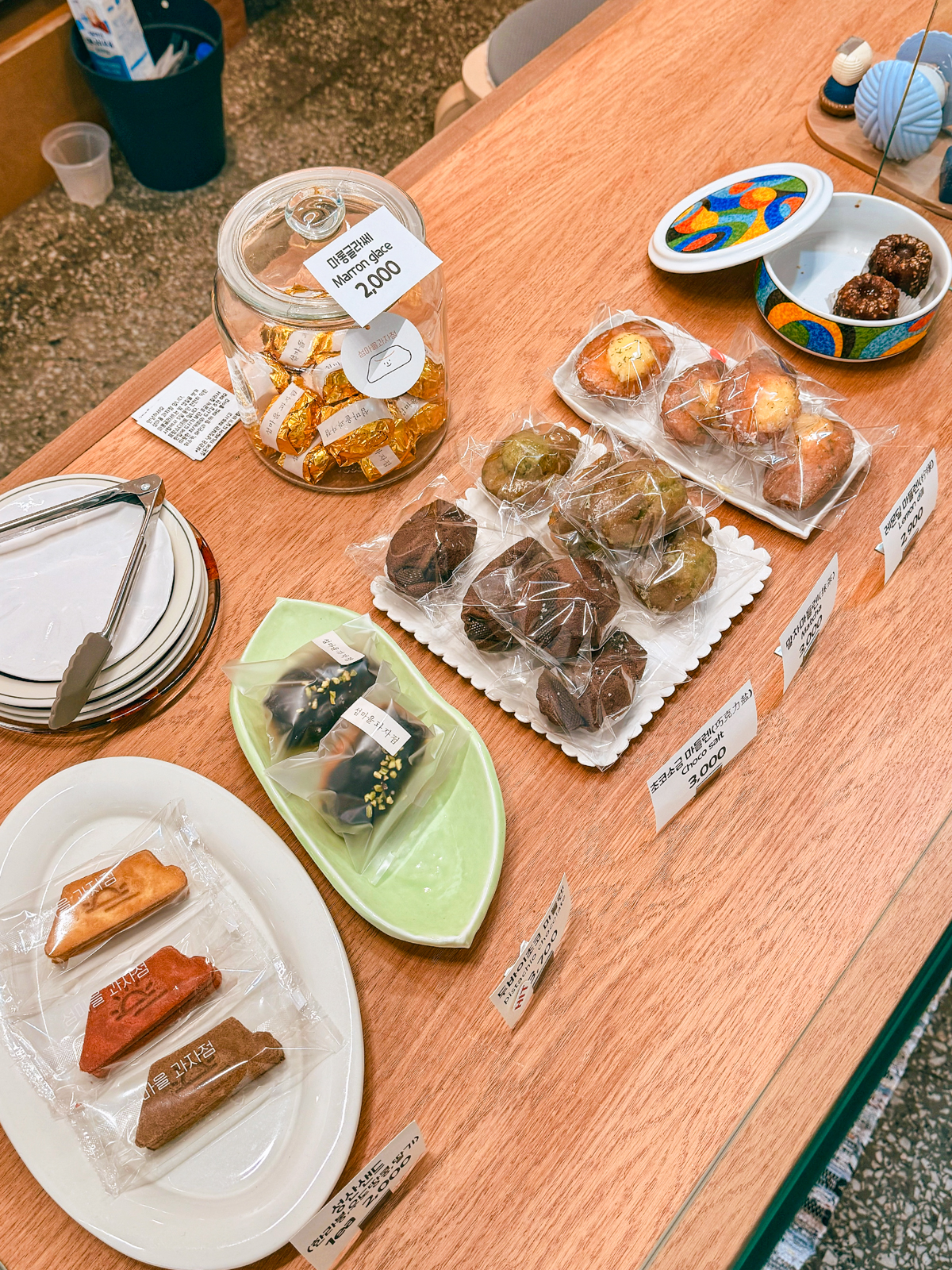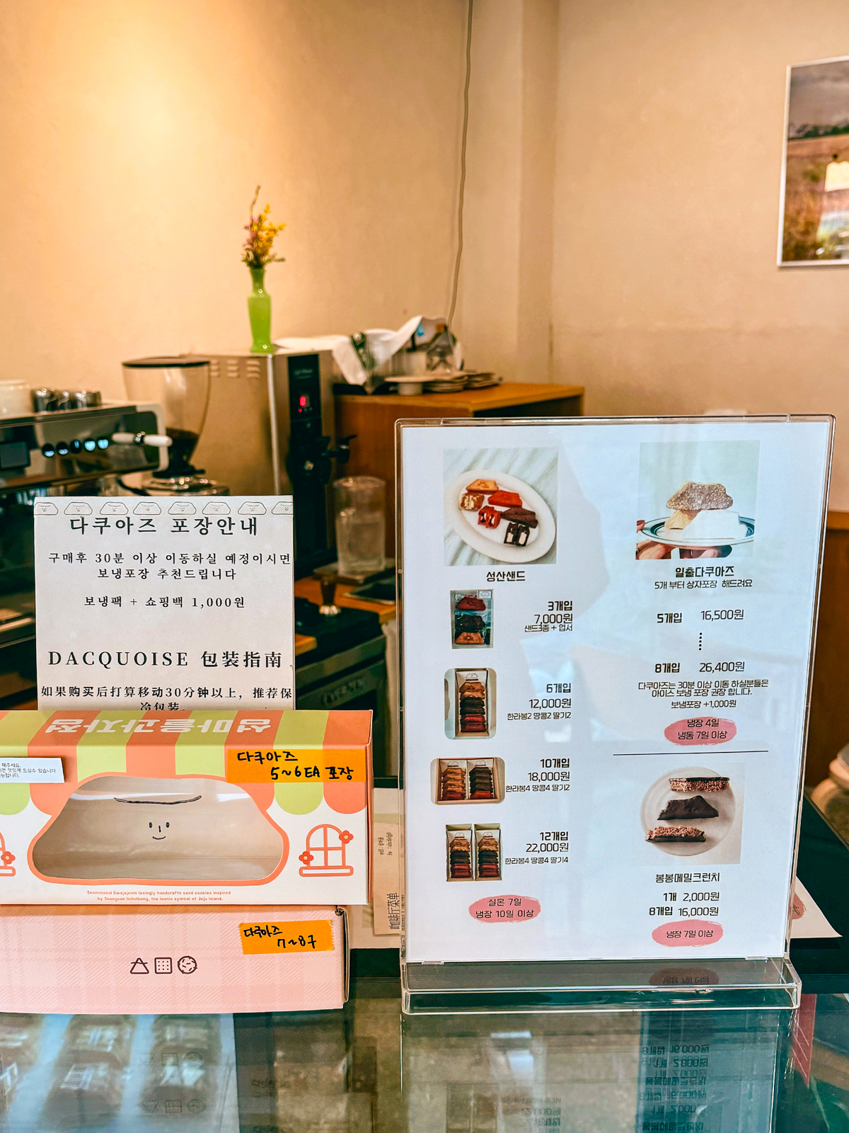섬마을과자정 매장 카운터 앞으로는 디저트로 사기 좋은 메밀쿠키, 다쿠아즈, 샌드, 마들렌, 휘낭시에가 진열되어 있었으며 포장 박스와 함께 메뉴마다 가격도 상세하게 표시되어 있었다.