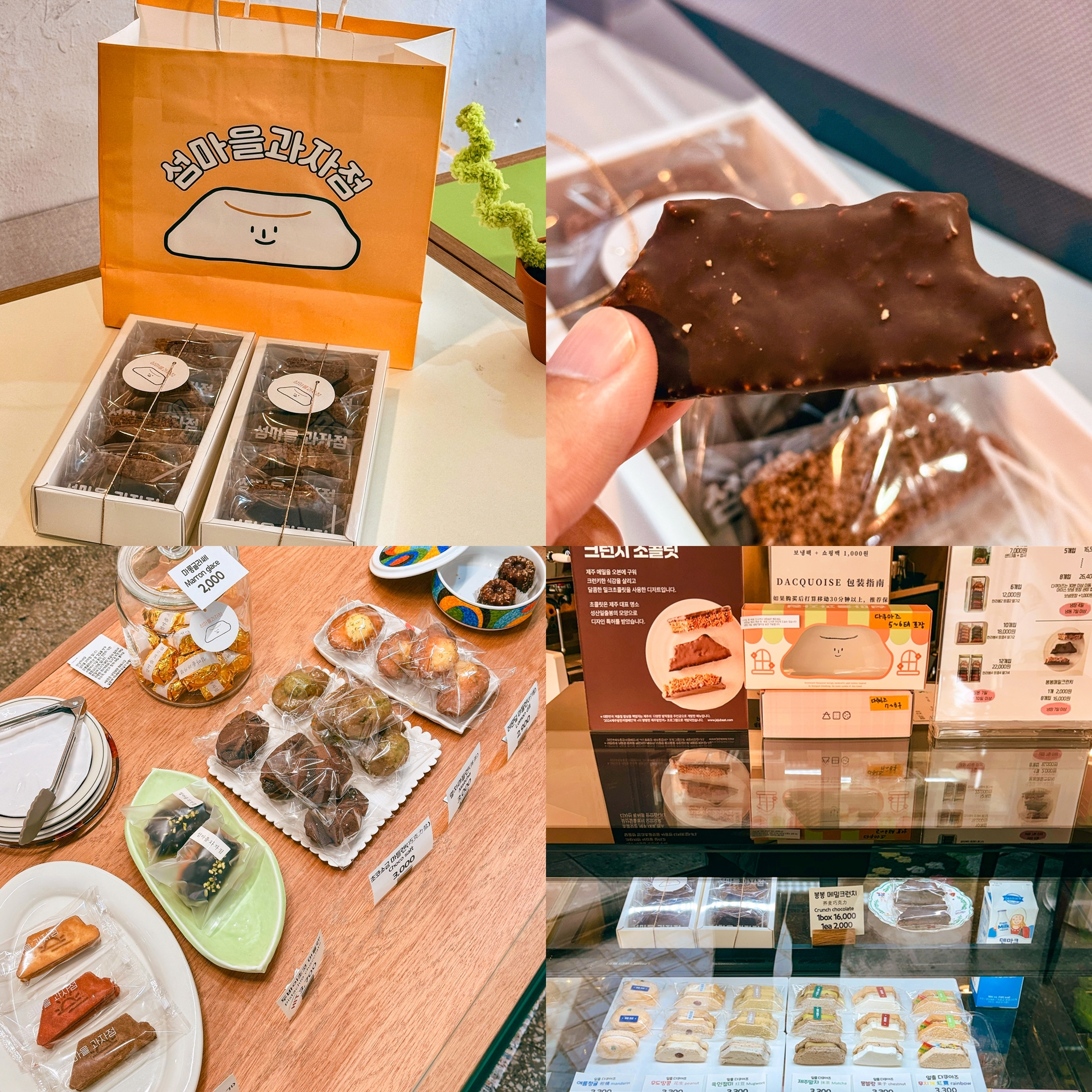 섬마을과자점이라고 불리는 이곳에는 제주도 동쪽 관광지인 성산일출봉을 표현한 디저트를 중심으로 우도땅콩, 녹차, 청귤, 밤크림, 쑥인절미가 들어간 쿠키도 있으며 다쿠아즈, 휘낭시에, 커피, 라떼 등도 매장에서 먹거나 포장할 수 있다.