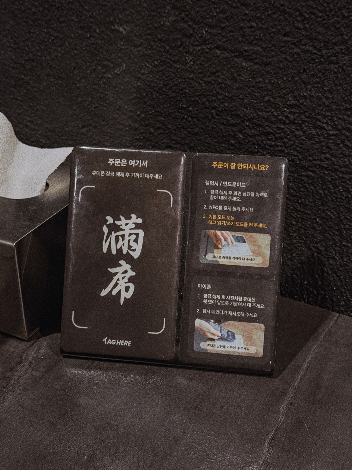 제주공항 근처 흑돼지 맛집 만석은 테이블에 놓인 NFC를 스마트폰 뒷면에 대면 홈페이지를 통해 메뉴를 주문할 수 있다.