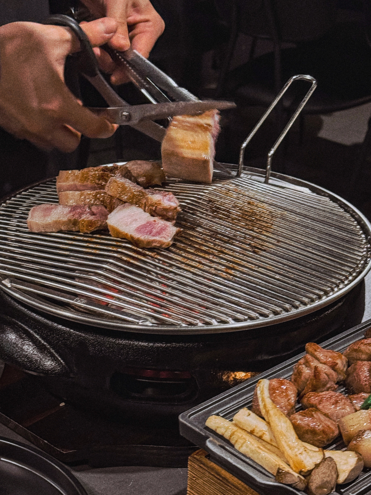 제주공항 근처 흑돼지 맛집에서는 목살이 구워진 후 이어 오겹살도 구워준다. 오겹살은 고기 겉부분에 있는 껍데기 부분을 가위로 잘라주는데 느끼함 없이 깔끔하게 먹을 수 있다.
