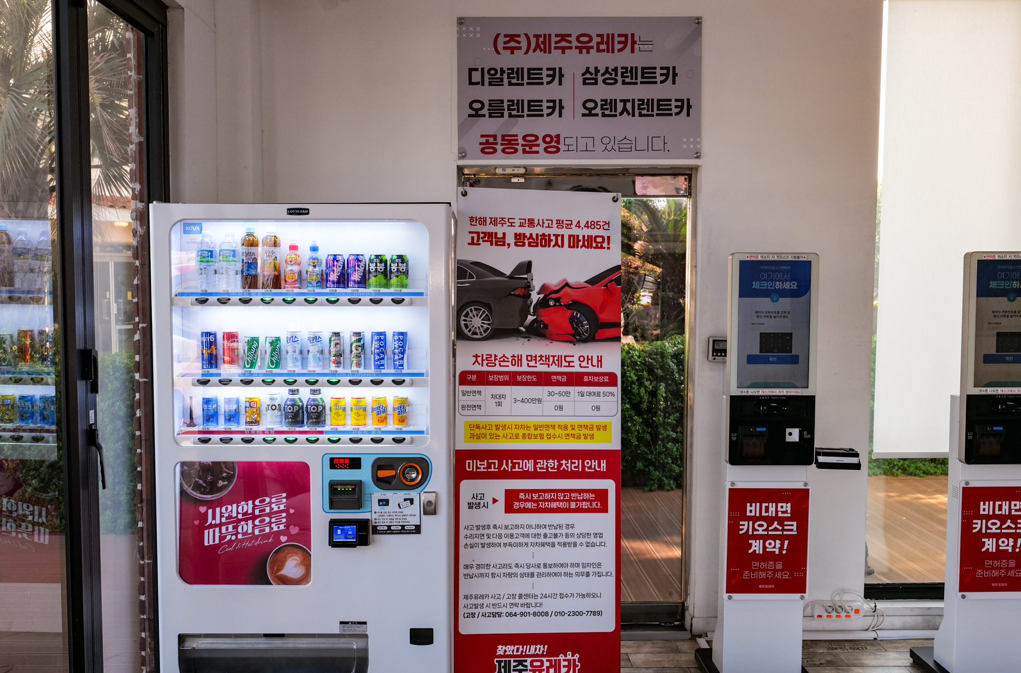 버스를 타고 차고지에 도착했다면 바로 앞에 있는 라운지로 들어가서 키오스크를 통해 제주 렌트카 비교사이트에서 예약했던 제주속으로 유레카 내역을 확인받은 후 자차 보장 조건에 대한 내용을 보고 서명하면 된다.