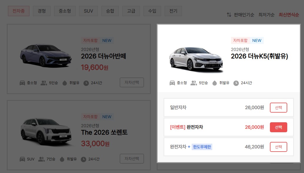 이날 이용했던 2026 더뉴 K5는 24시간 기준 완전자차를 포함해 대여 가격은 26,000원대였다. 참고로 비용은 평일, 주말, 성수기에 따라 요금이 바뀐다.