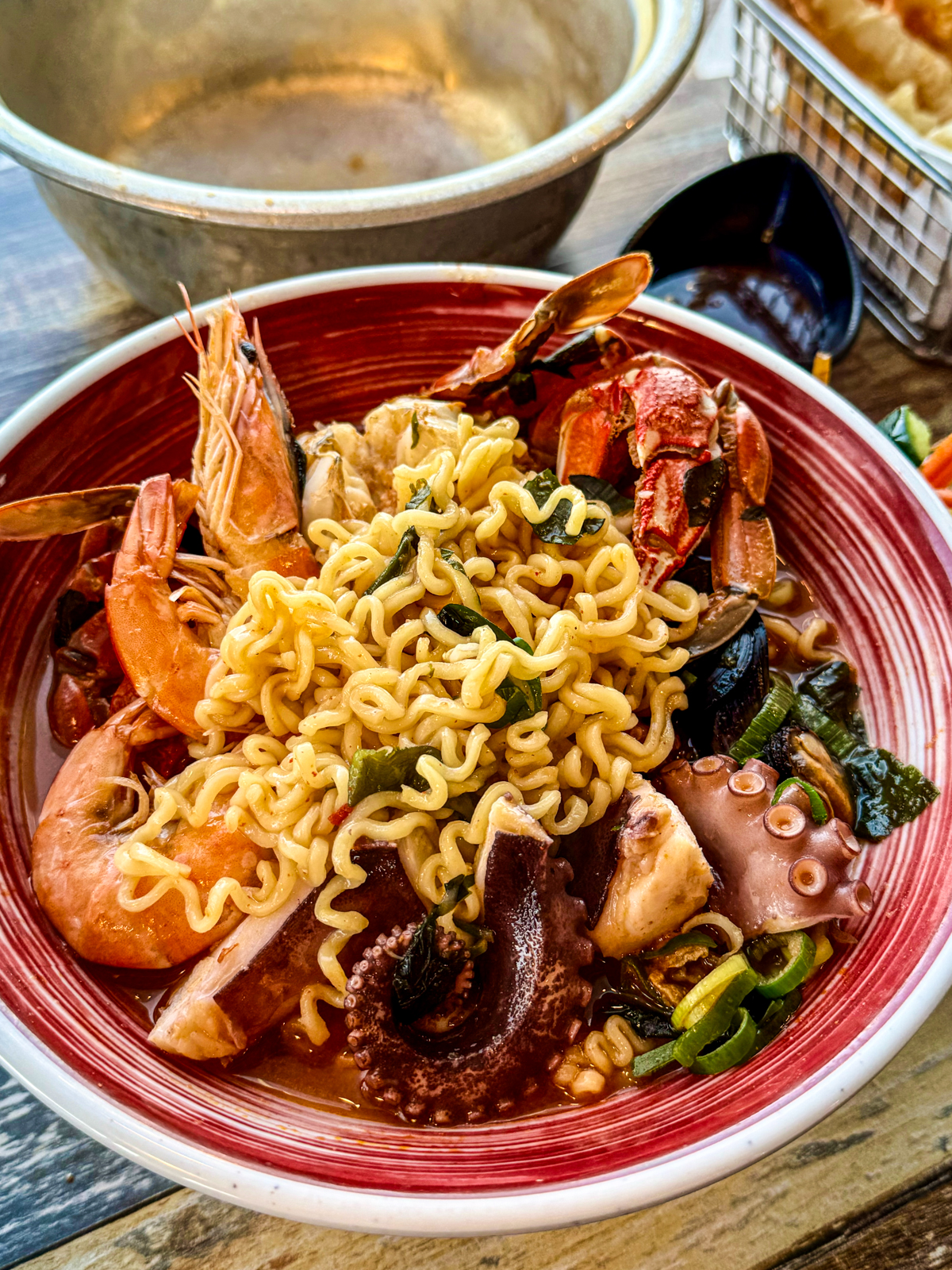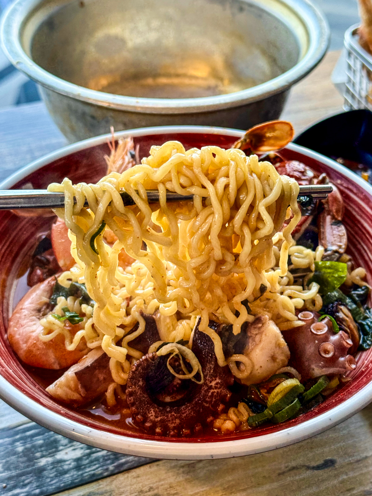 매운 맛을 먹으려다가 아침이라 순한맛을 선택했는데 신라면보다 살짝 덜 매운 맛이었다. 라면에는 황게, 문어, 새우, 가리비, 해초류와 함께 스프가 아닌 이곳에서 직접 개발한 수제소스가 들어 있다.