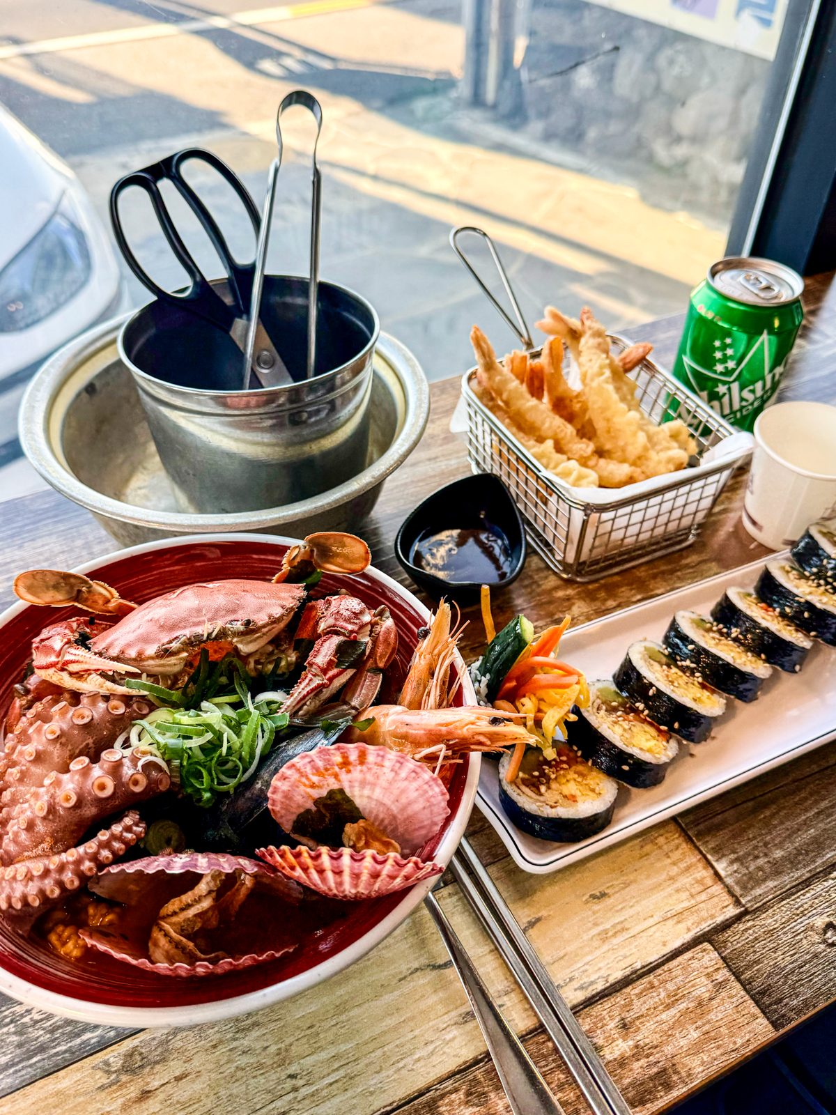 제주 용담해안도로 맛집 마루해물라면에 방문했던 날에는 황게라면에 큼지막한 문어를 추가했고 여기에 더해 시그니처 메뉴인 계란김밥과 새우튀김을 주문해 혼밥 식사를 했다.