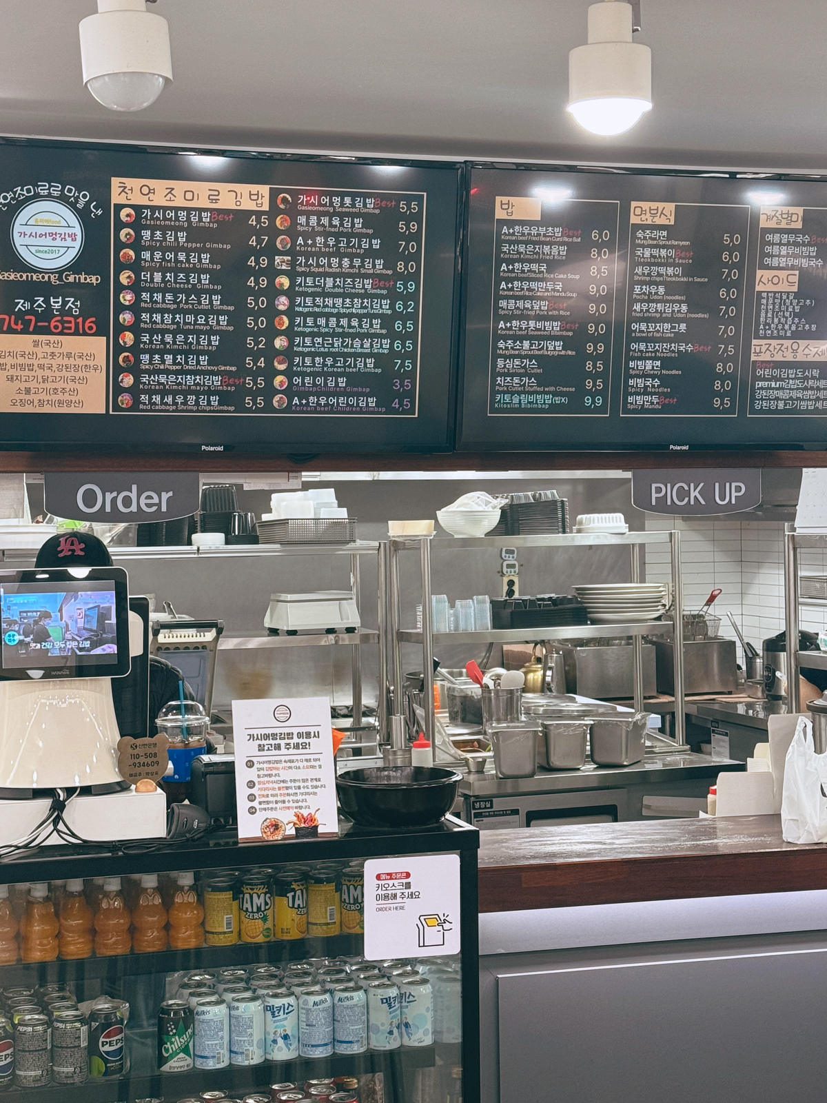 제주공항 근처 김밥 맛집에 방문했던 날에는 베스트 메뉴인 천연조미료 기본 김밥, 숙주라면, 국물떡볶이를 주문했고 기다리는 동안 매장 내부 사진을 담아봤다.