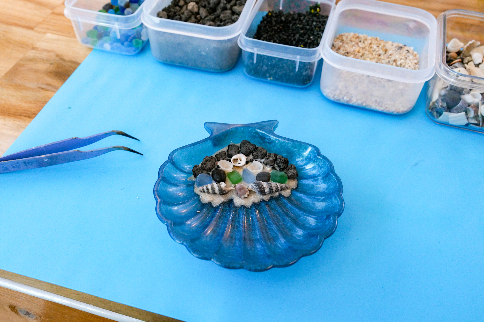 제주 원데이클래스 레진아트 체험을 통해 트레이 속 모래와 바다 표현이 완성되면 노꼬메 공방에 마련된 장식물을 올려주는 작업이 진행된다.