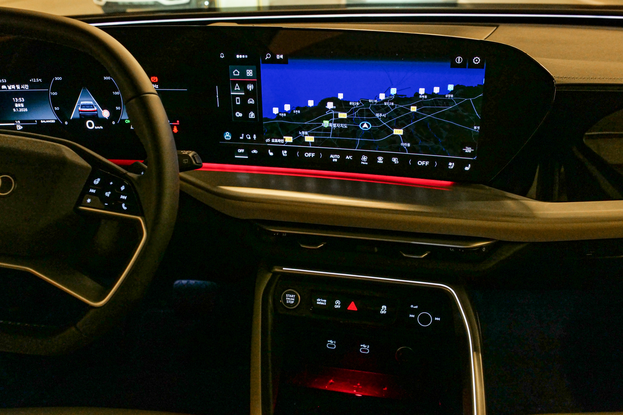 아우디 Q5 중앙 14.5인치 디스플레이는 내비게이션, 블루투스, 라디오, 전화, 안드로이드 오토, 애플 카플레이, 운전자 지원 시스템, 디지털키, 사용설명서 등 기능이 들어 있었으며 바로 하단에 에어컨 히터 조작, 열선시트, 통풍시트 등을 터치로 할 수 있게 제작되어 있었다.