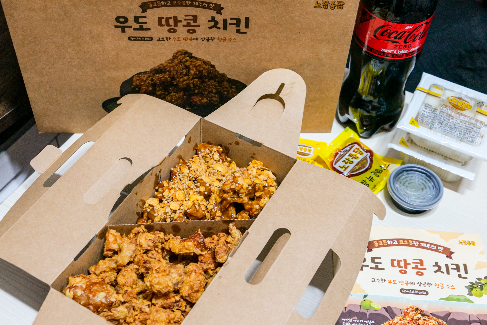 최근 전국 500여 개의 지점을 가지고 있는 노랑통닭에서는 한정판으로 제주 우도땅콩치킨을 출시했고 상큼한 청귤 소스에 찍어 곁들일 수 있다는 말에 회사 사무실 근처에 있는 제주용담점에 방문하여 포장 후 먹어봤다.