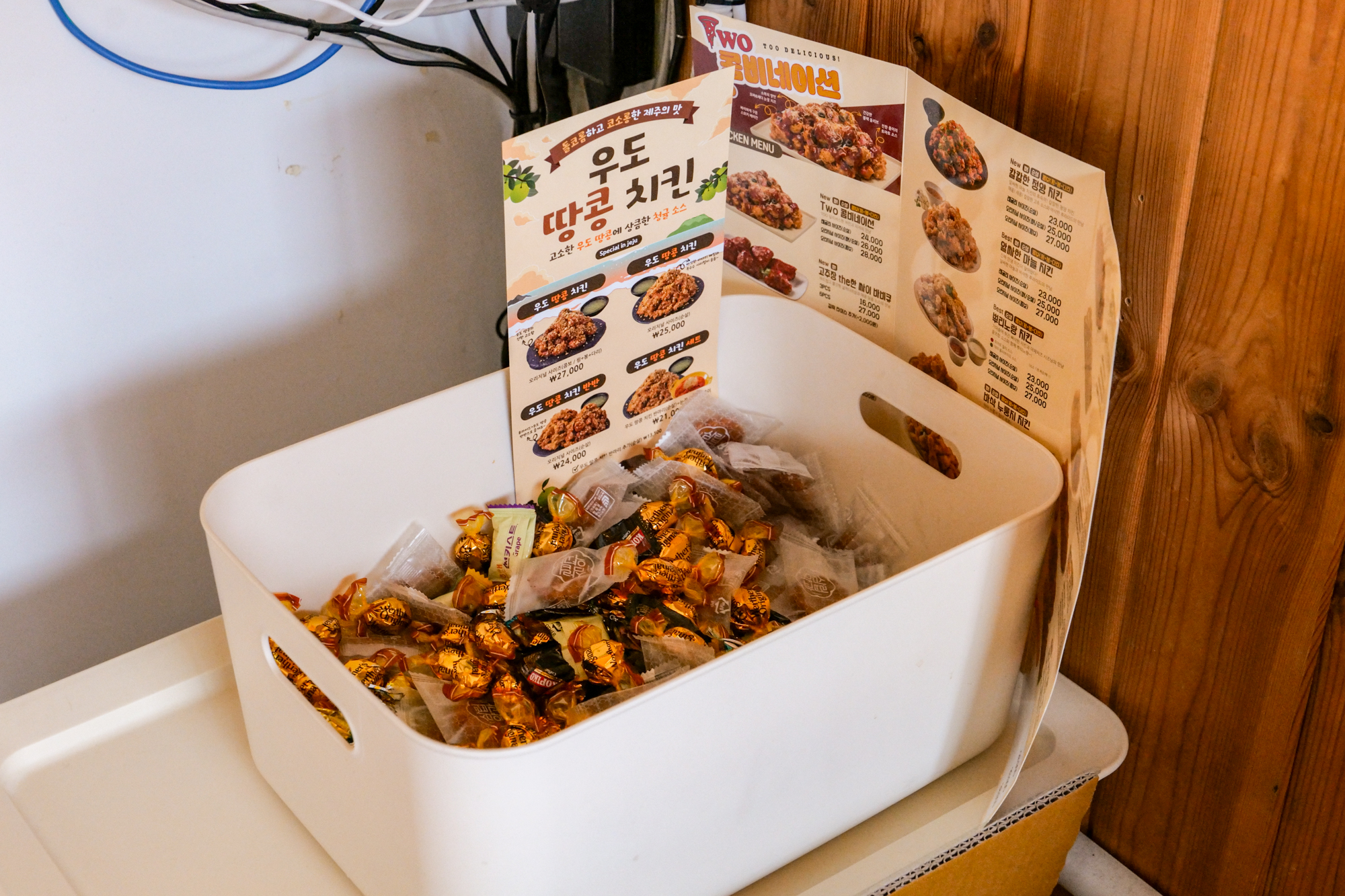 제주 노랑통닭 매장에는 우도땅콩치킨 포장을 하러 온 방문객을 위해 사탕 등 사은품을 매장 한쪽 공간에 두었고 만족도 조사 이벤트도 진행 중이었다.