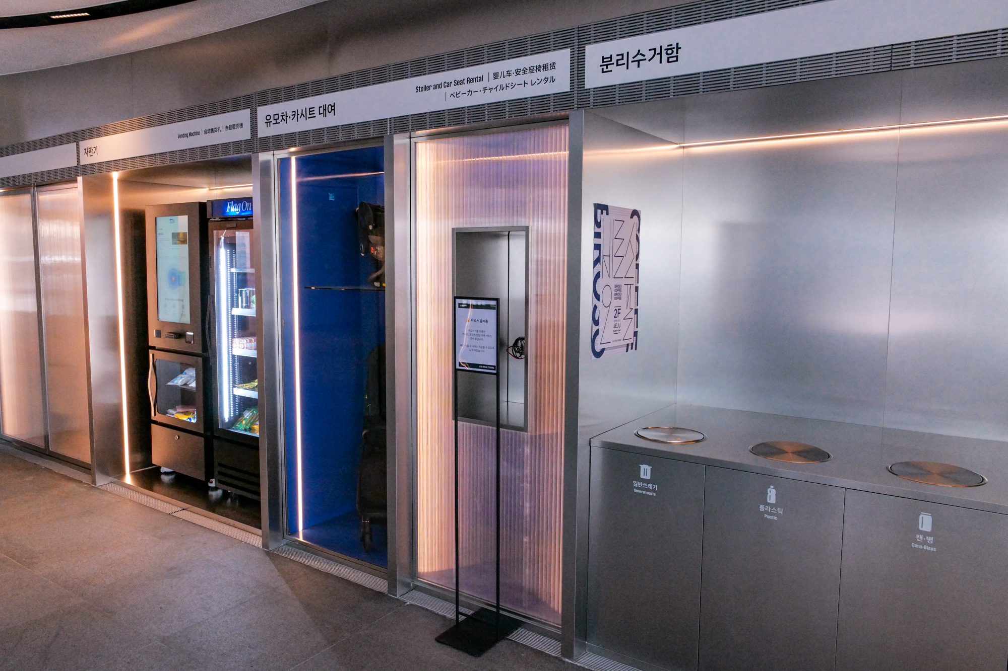 제주도 전기차 렌트 후기 예약 시간보다 일찍 도착하여 본관 라운지에서 기다리는 동안 내부에 있는 시설을 구경해봤다. 1층에는 음료수, 과자, 티슈, 물티슈 등을 살 수 있는 카드전용 자판기가 있으며 바로 옆에 유모차 카시트도 있었으나 아직 사용할 수 없었다.