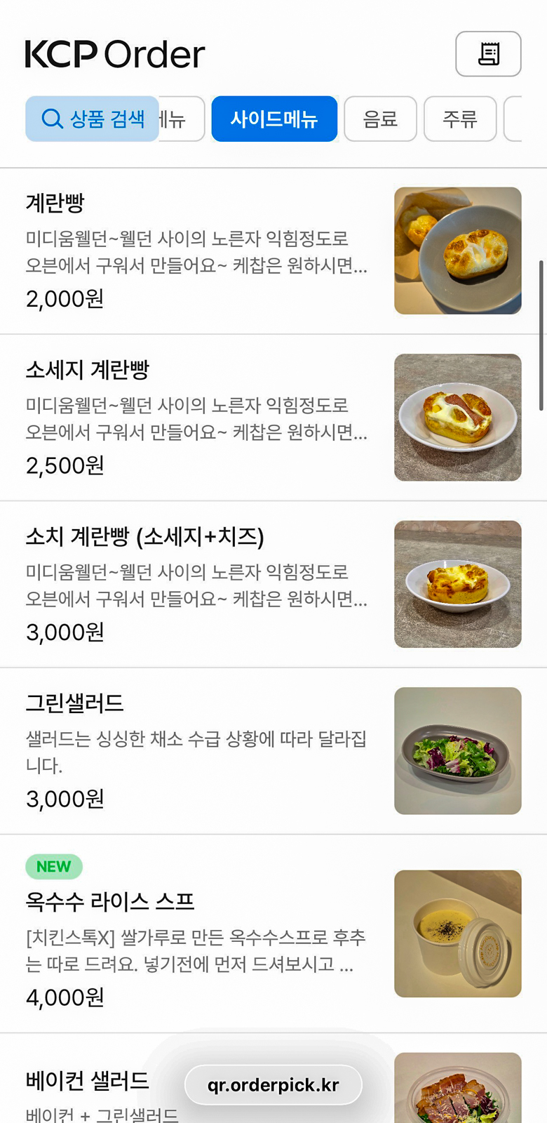 사이드메뉴로는 소세지, 소세지 치즈 계란빵과 그린 샐러드, 옥수수 라이스 스프 등 취향에 따라 고르기 좋은 메뉴로 구성되어 있었다.