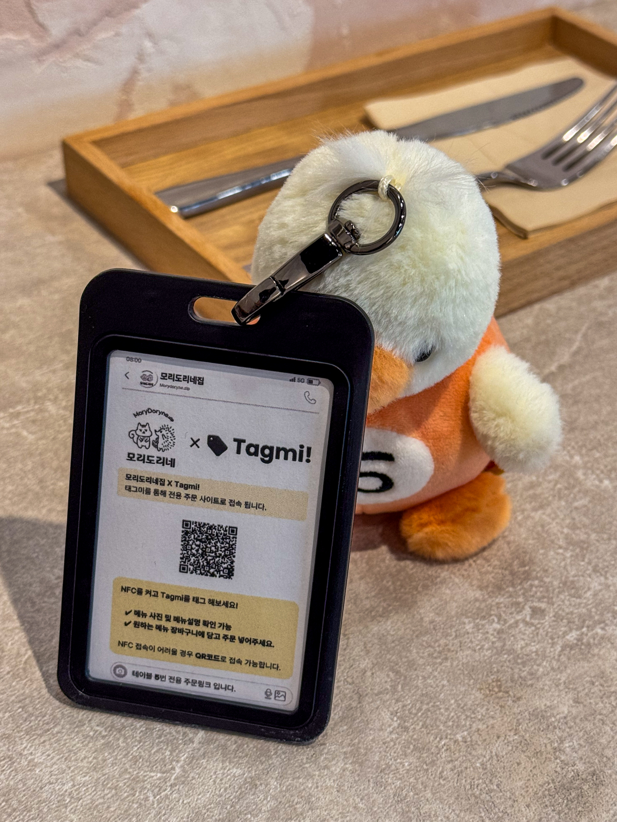 제주 브런치 맛집 노형 모리도리네집은 테이블에 놓인 인형에 부착된 QR코드를 스마트폰 카메라로 촬영하면 메뉴판을 보고 주문을 할 수 있다.