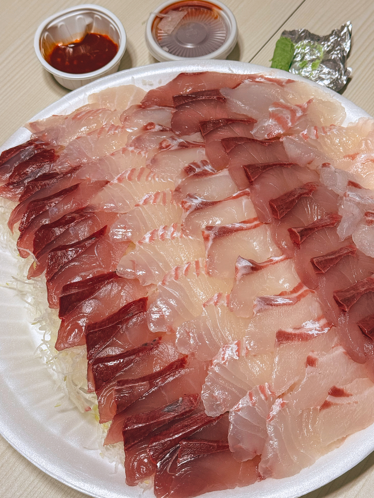 이곳에 방문했던 날에는 방어회, 참돔회, 광어회로 구성된 일반 모듬회로 3~4명이 함께 먹기 좋은 대 자를 포장했고 가격은 45,000원이었다.