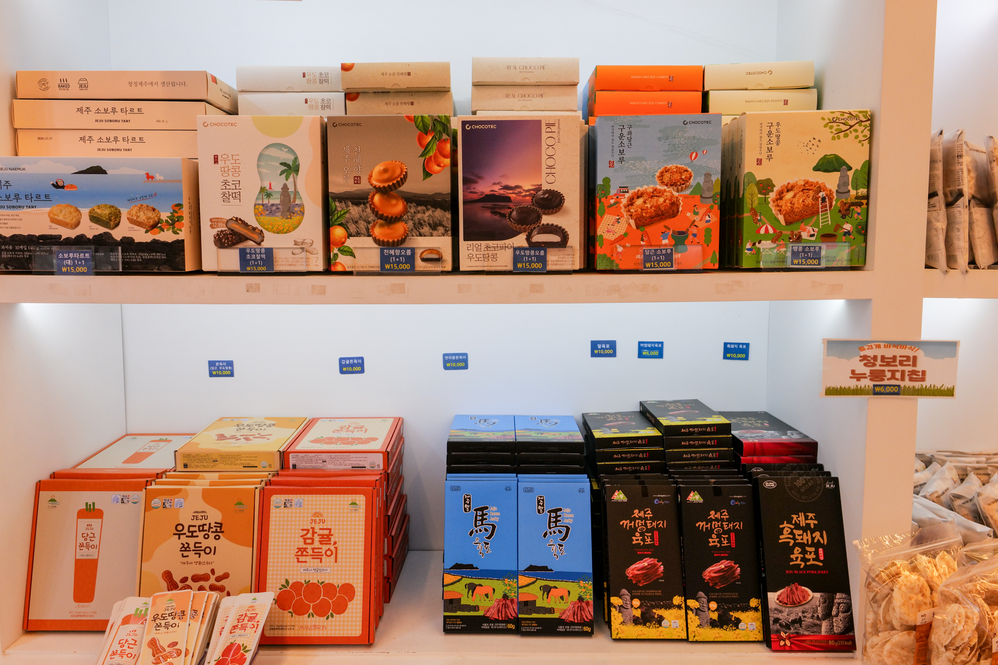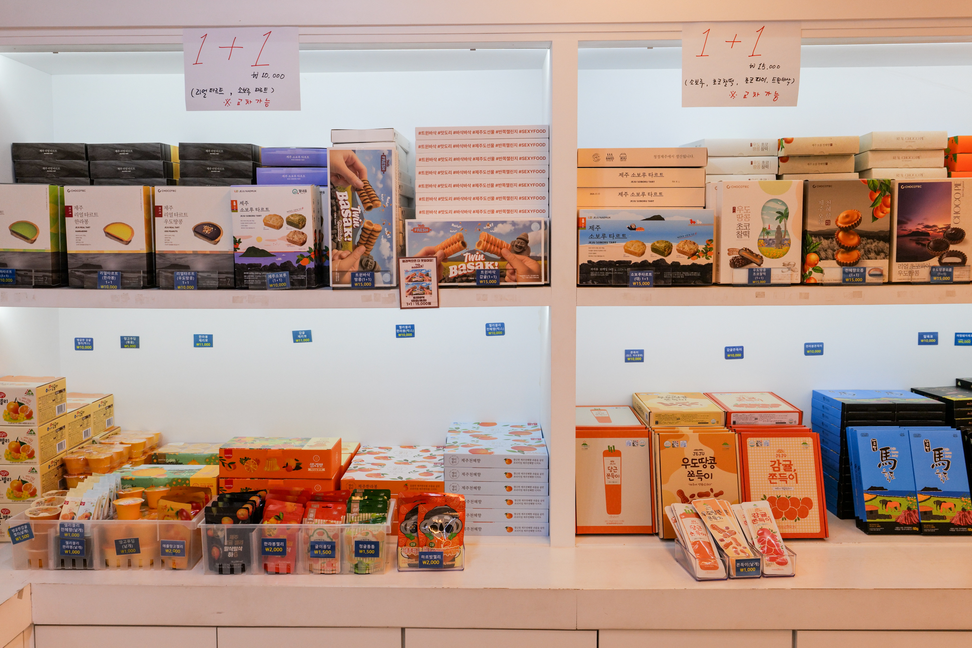 제주도 기념품 사기 좋은곳 만달에는 라면 쿠키, 타르트, 초콜렛, 젤리, 쫀득이, 육포 등이 있으며 현재 진행 중인 이벤트를 통해 1+1 특가로 구매할 수 있다.