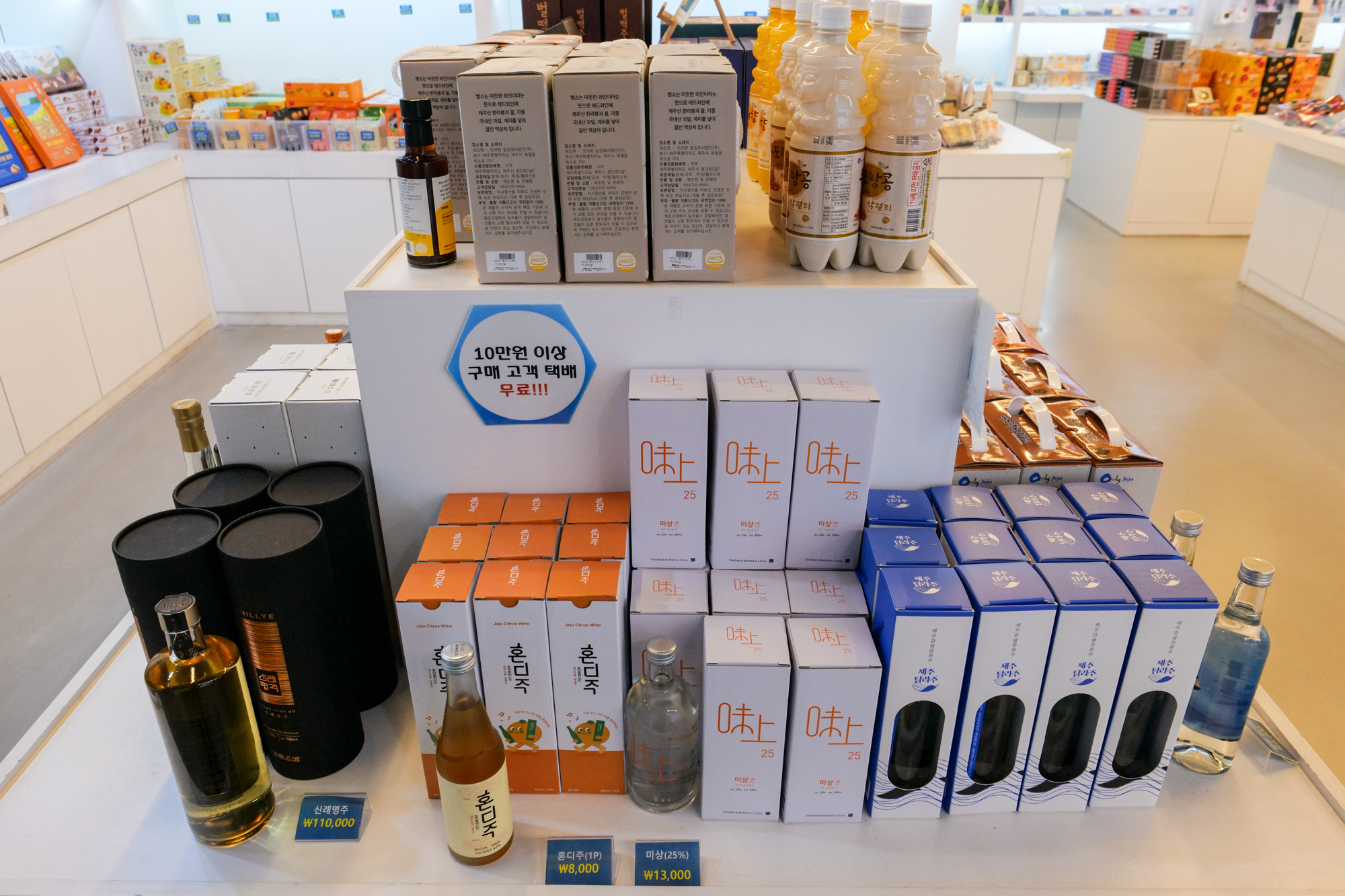 오메기술, 고소리술, 막걸리, 혼디주, 신례명주, 미상, 탐라주, 벌떡주는 물론 천혜향, 동백꽃, 한라봉을 담아낸 와인과 3종 미니어처 전통주 등으로 구성됐다.