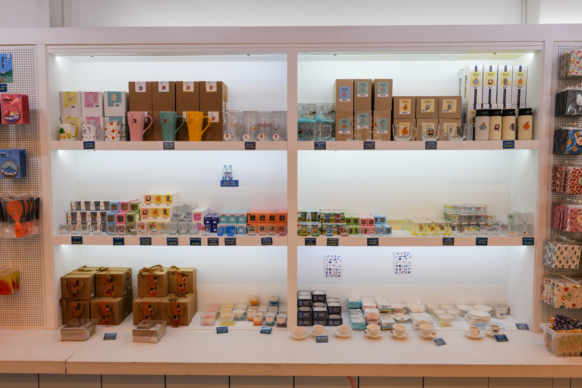 이외에 벽면에 위치한 진열장에는 다양한 소주잔, 맥주잔, 머그잔, 텀블러, 티코스터, 캔들 등이 있으며 낱개로 개별 포장되어 여행을 마치고 돌아가는 길에 비행기 기내 반입이나 수화물에 넣어도 파손될 걱정을 하지 않아도 된다.