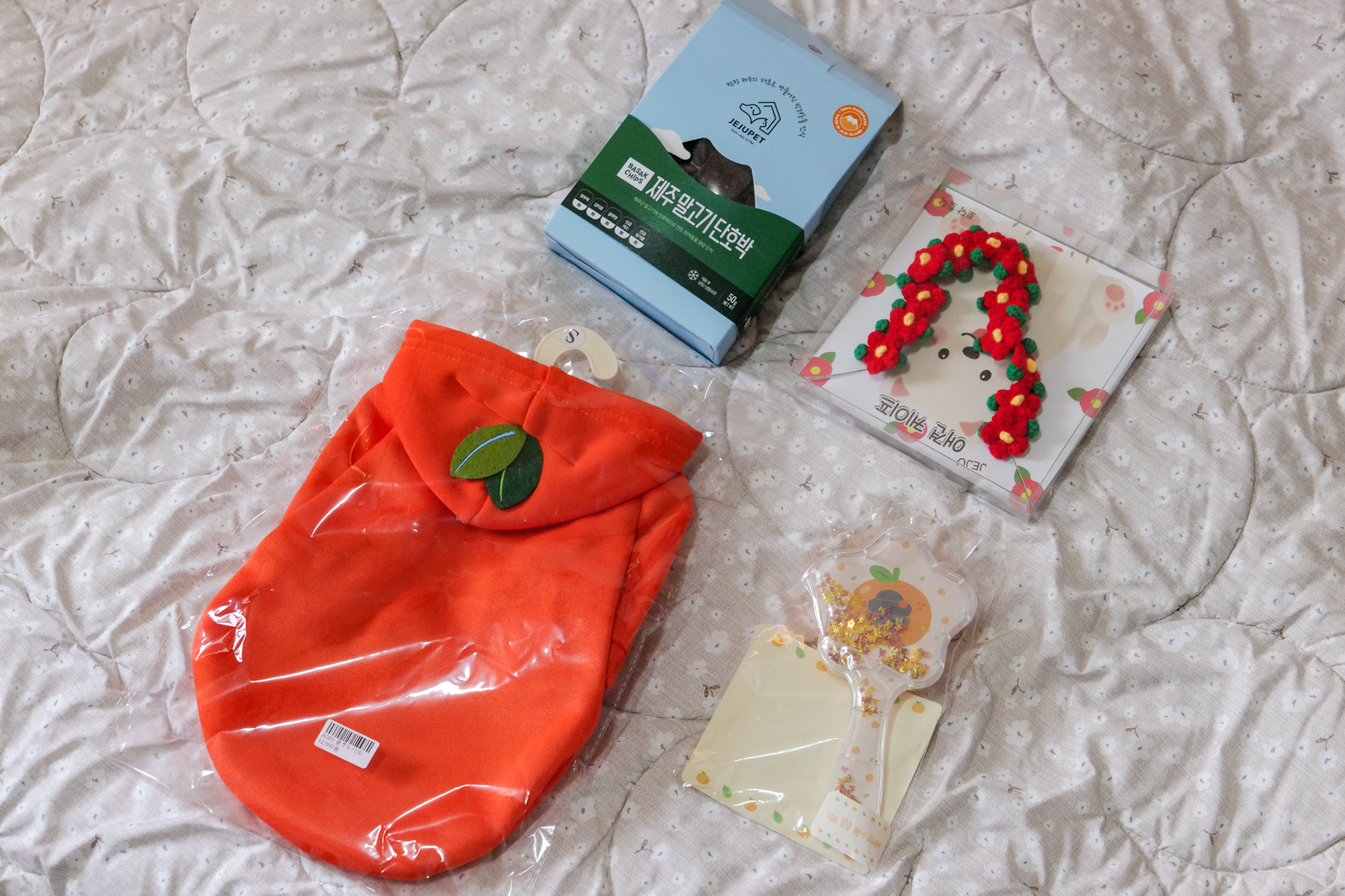 제주도 기념품 사기 좋은곳 만달에 방문했던 날에는 설이에게 입혀줄 감귤 강아지옷, 동백꽃 목걸이, 머리빗과 함께 말고기 단호박 수제간식을 내돈내산으로 구매 후 집에 와서 입혀봤다.